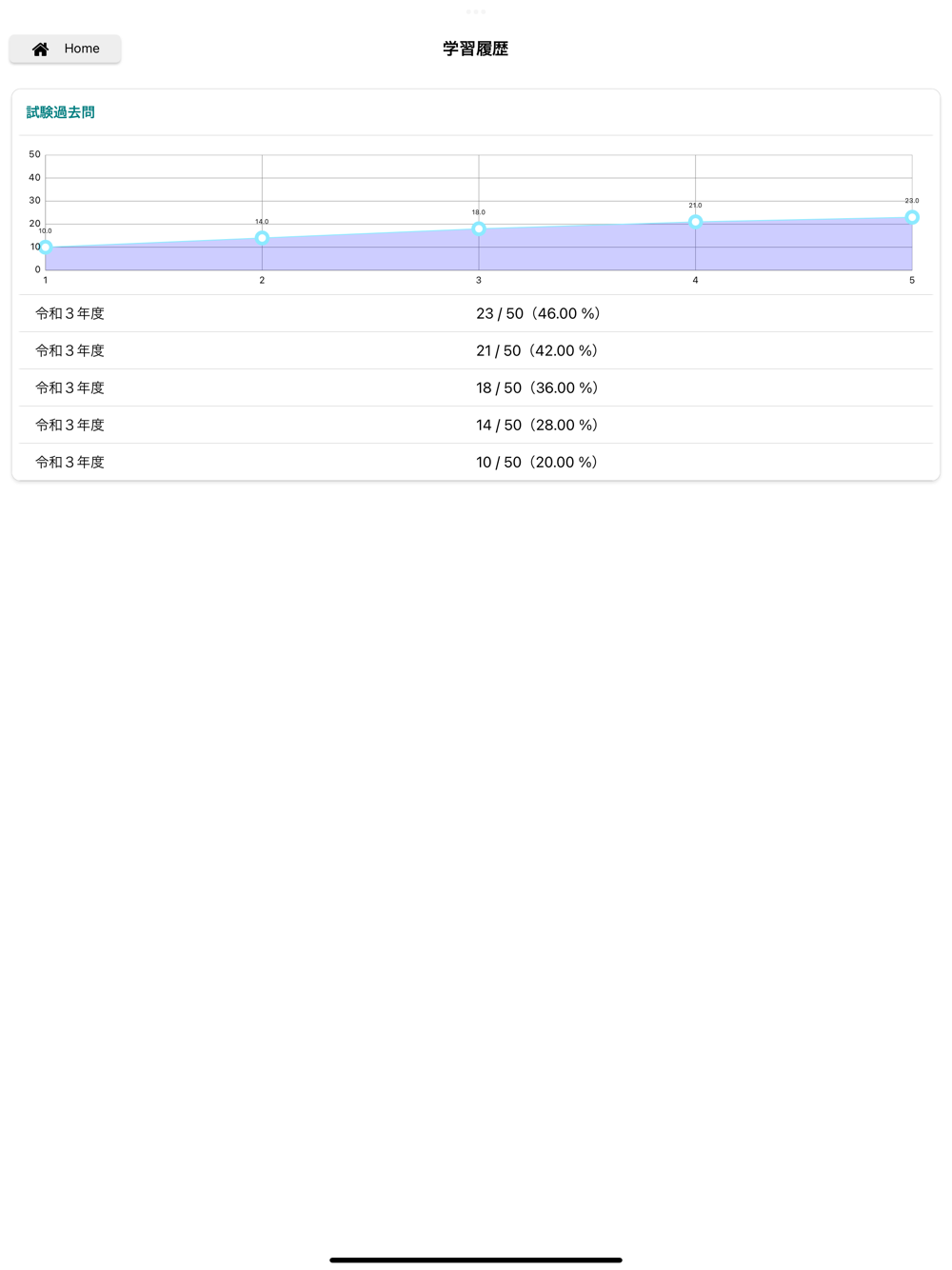 過去問から年度別の試験を学習することができます。学習実績をグラフで確認でき、学習成果を把握できます。
