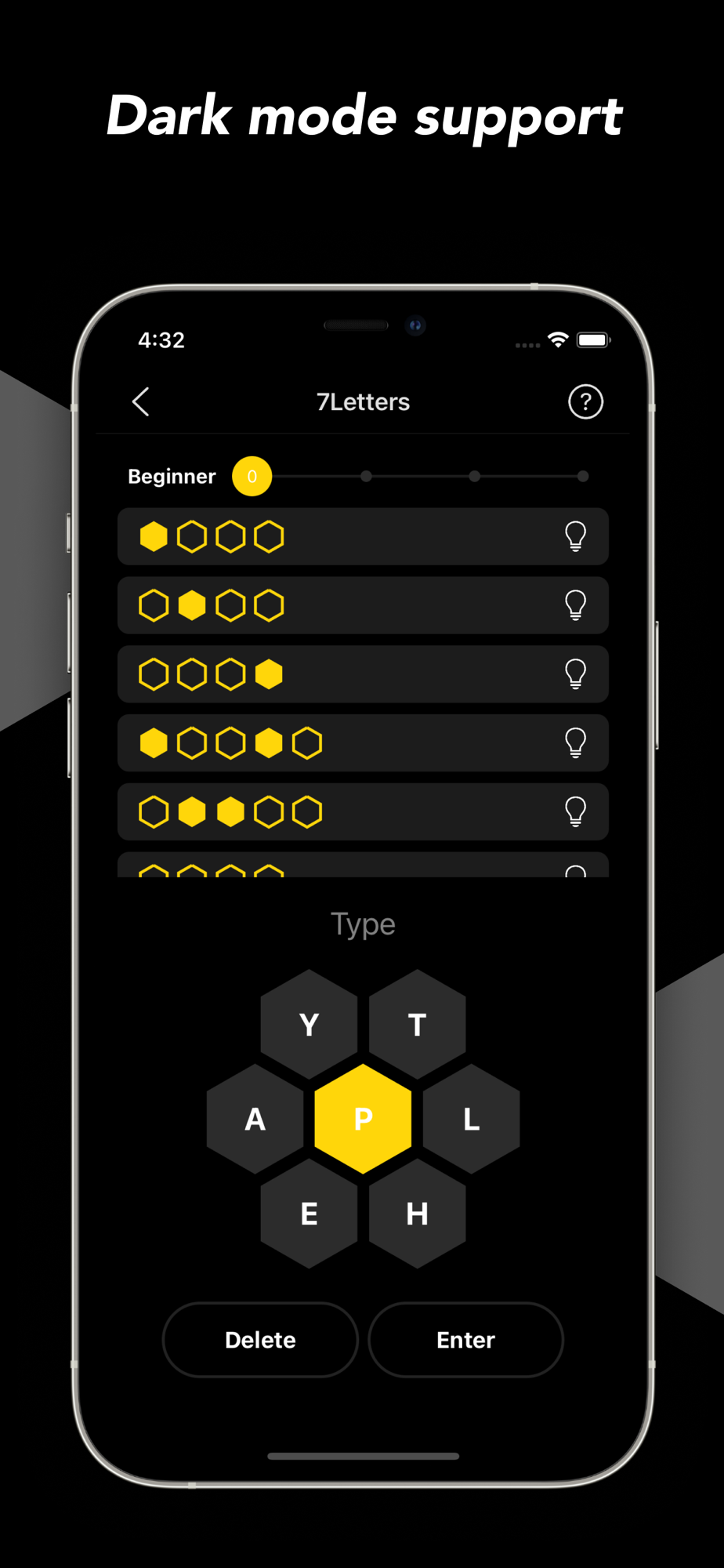 7Letters is a daily word puzzle of finding possible words which minimum 4 letters by using to given 2 vowels and 5 consonants also "Golden Letter" (yellow one, center of the honeycomb) is required. This Golden Letter can be vowel or consonant. You can use any letter in multiple times. In this finding process, you can find patterns of the words listed in alphabetical order. filled honeycomb symbol represents Golden Letter, empty honeycomb symbol represents any of other letters. Use the hint at the top to help figure it out.