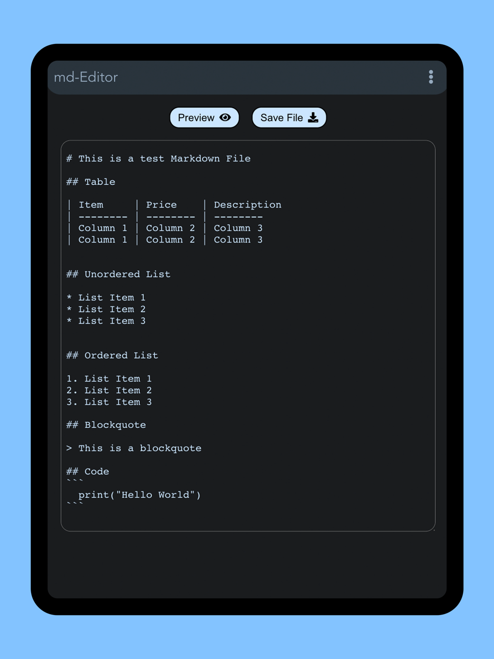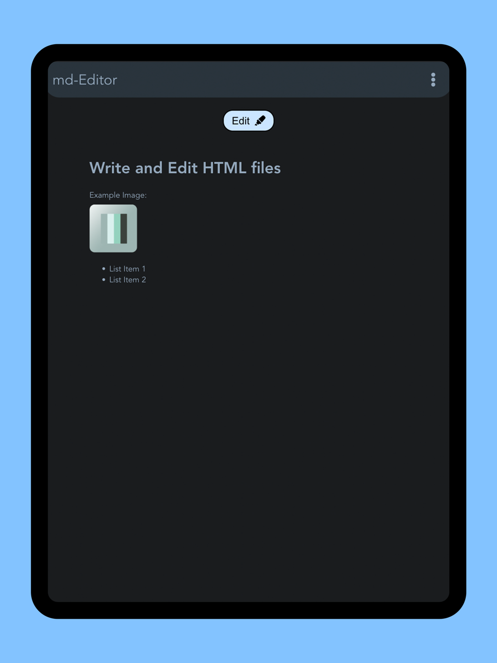 Create and Edit Markdown files and save them on your device or import exiting .md files and preview them directly in the App and share the files with other people.