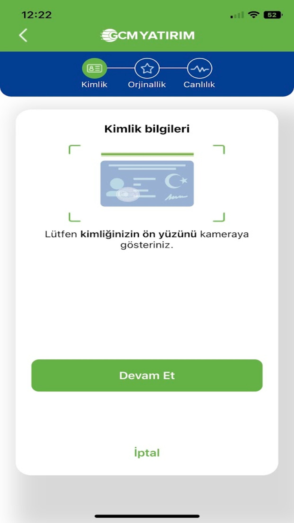 GCM Yatırım Kimlik Doğrulama uygulamasını kullanarak yatırım hesabı işlemlerini tamamlamak artık çok kolay! Nerede olursanız olun, müşteri temsilcilerimiz ile görüntülü görüşme yaparak uzaktan kolayca GCM Yatırım hesabı açılış işlemlerinizi tamamlayabilirsiniz.