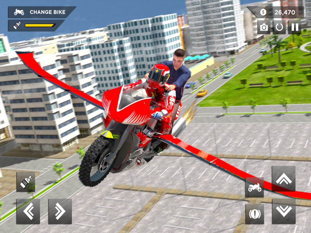 Welcome to the Flying Bike Real Simulator 3d game. It is a new dimension of thrill and adventure flying Game. Fly the bike simulator to become an extreme bike rider. Start the engine and go on a lifetime adventure with desert stunts bike racing thrills in the Flying Bike Real Simulator game. Sports bike seats are waiting for you to play with the new flying bike simulator. Compete with hard-core bike best game players, bike game fans & bike racing gamers. Become the best bike racer, accelerate your racing bike to perform extreme stunts on offline & online tracks. Challenge the competition as you drive through a variety of treacherous tracks while enjoying the realistic bike physics and fast-paced gameplay. This new game let you do bike stunts on impossible tracks. As you unlock new fast bikes with unique designs! Fly at high speeds through the city on your Flying Bike Real Simulator 3d. Witness the definitive bike racing experience with our games. Bike Racing 3D is easy to pick up but hard to master which will keep you in the zone for hours. Here is your chance to step up and prove that you are the most intense and competitive biker!