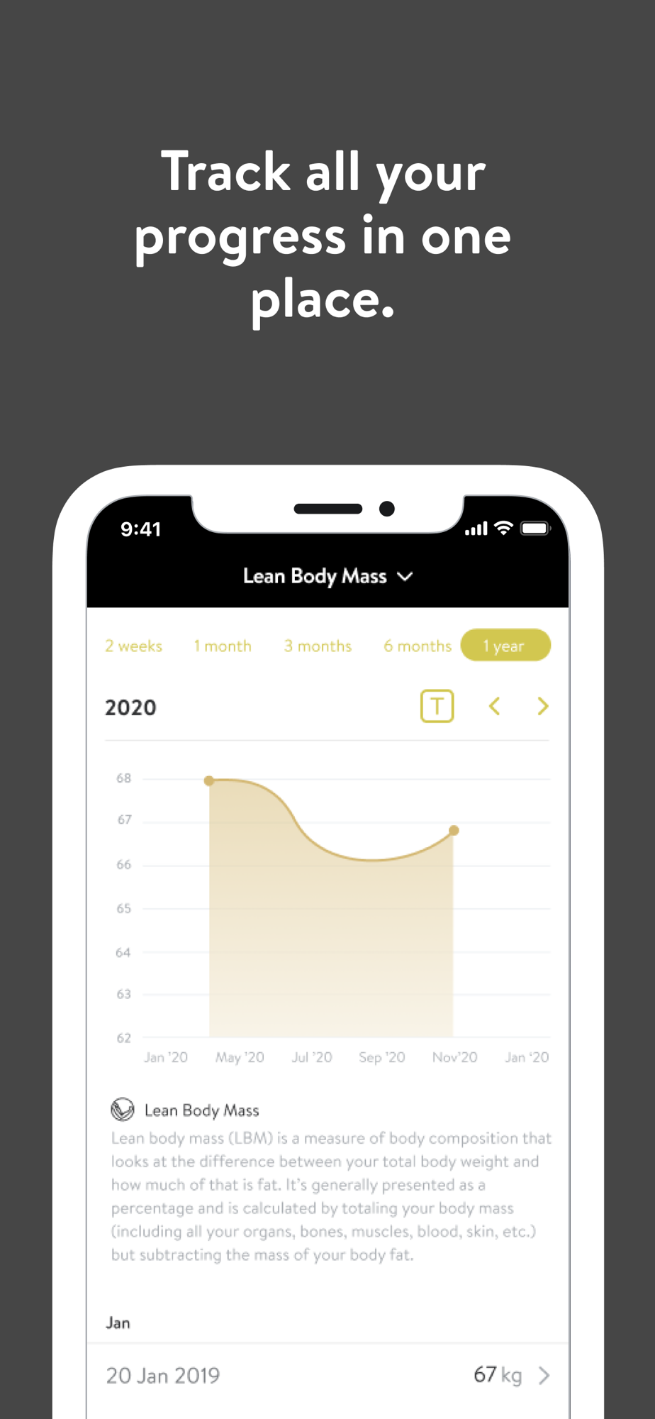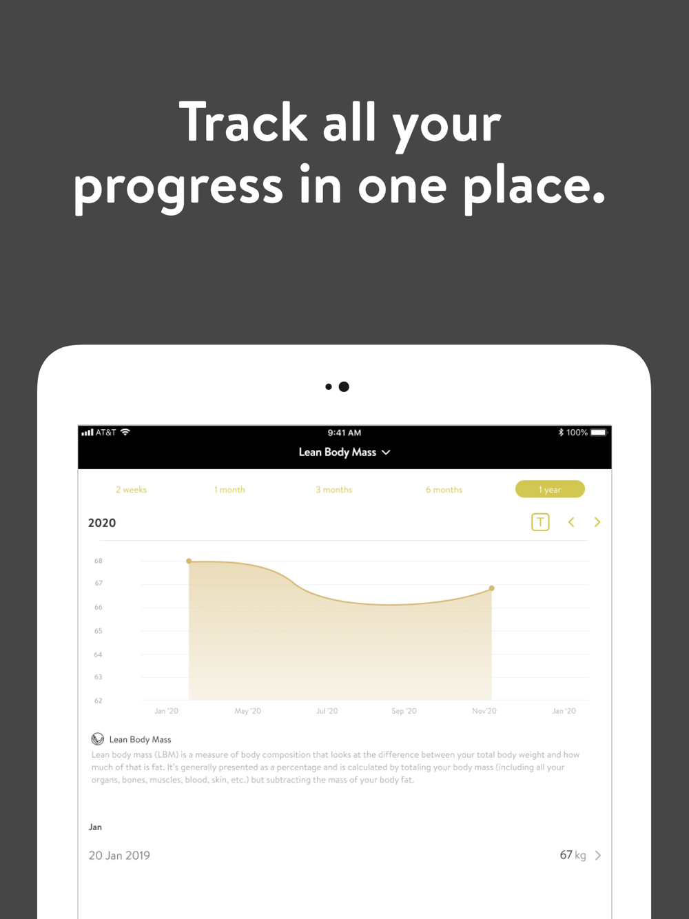 - Track body measurements and take progress photos