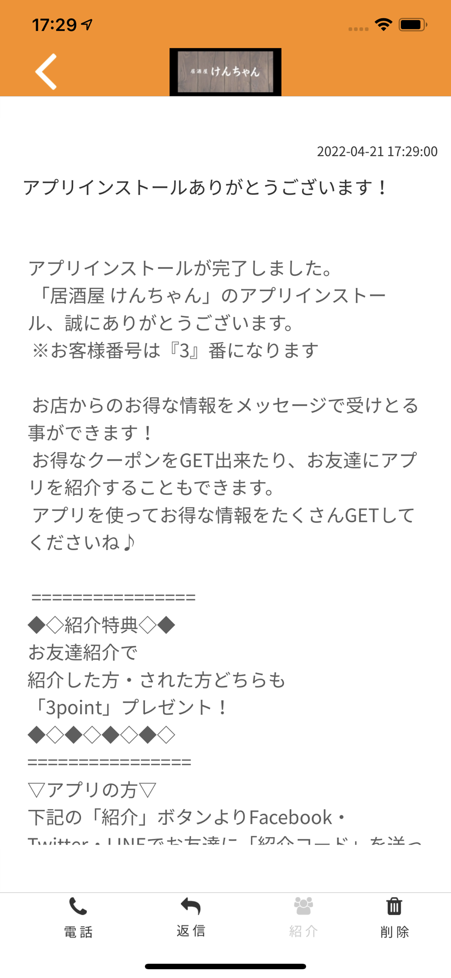 居酒屋 けんちゃんのアプリをSNSを通じてお友達に紹介する事ができます。