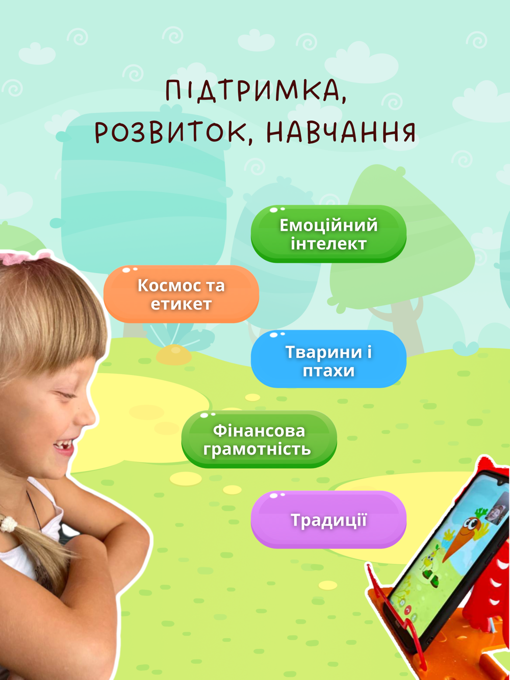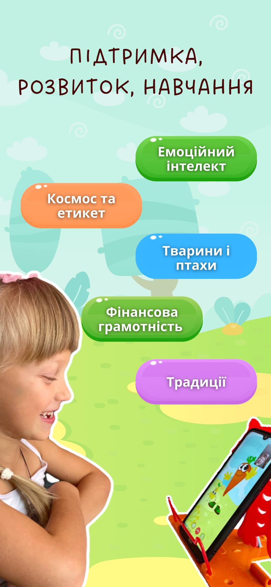 Чарівна Морквинка із задоволенням стане справжнім другом для малечі. Під час відеозустрічей у застосунку разом вони поринуть у казковий світ, будуть спілкуватися, навчатися, грати у розвиваючі ігри та жартувати!