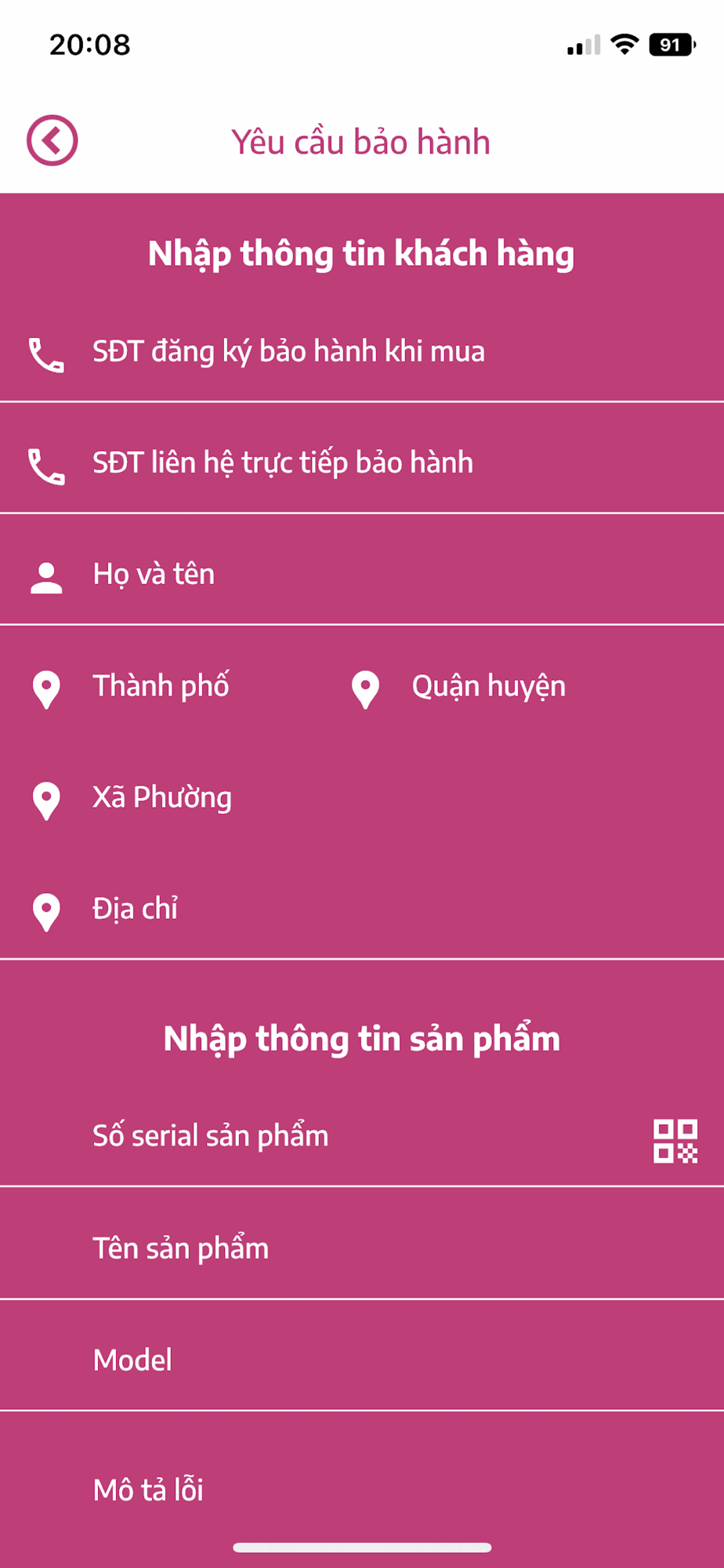 Đặt lịch bảo hành, Báo thông tin hỏng, lỗi sản phẩm về trung tâm bảo hành.