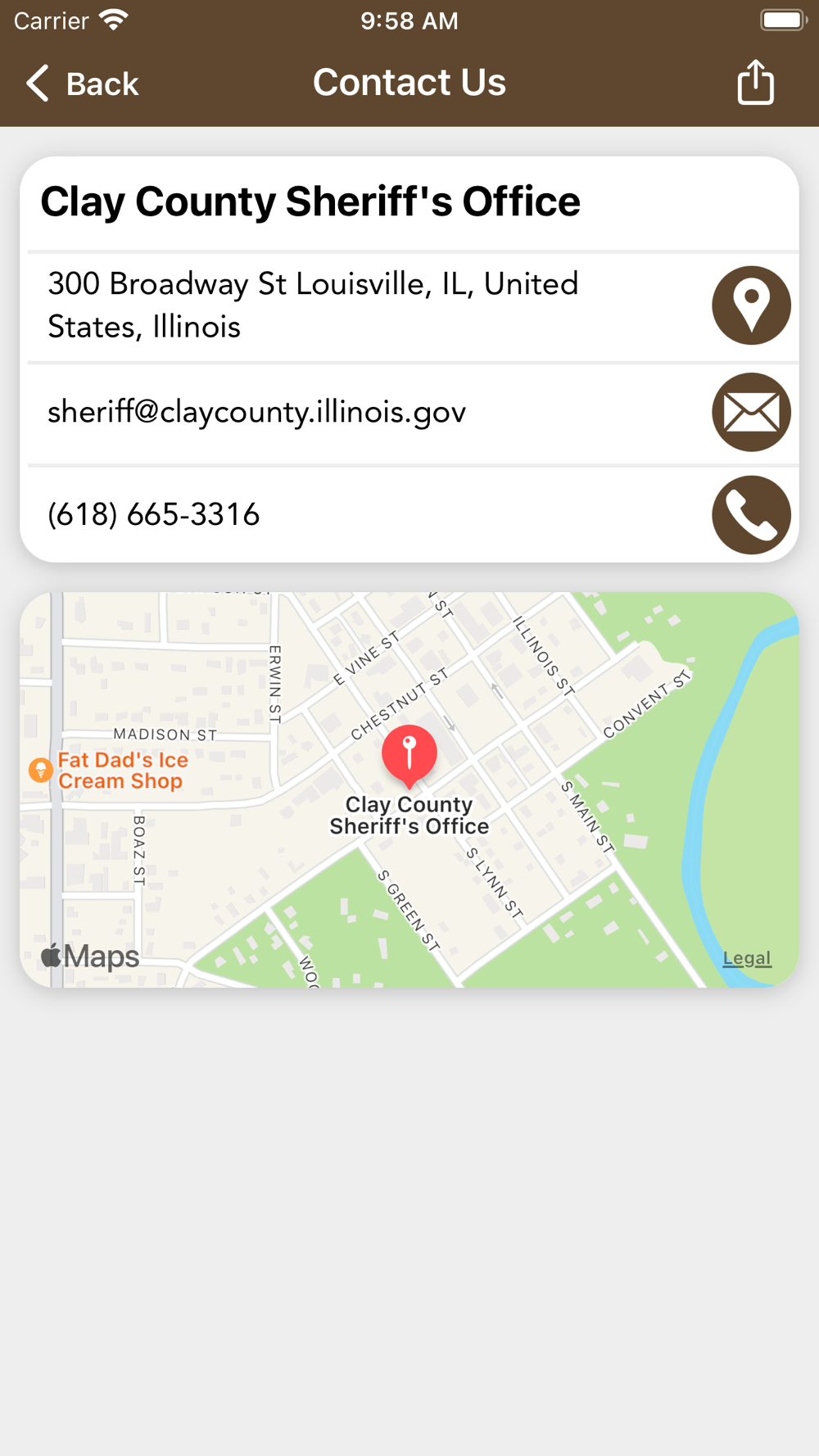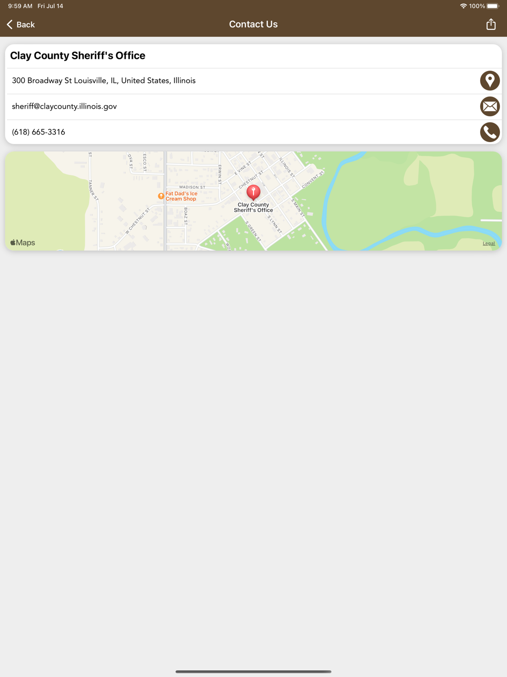 The Clay County Illinois Sheriff’s Office mobile application is an interactive app developed to help improve communication with area residents. The Clay County Sheriff App allows residents to connect with the Clay County Sheriff’s Office by reporting crimes, submitting tips, and other interactive features, as well as providing the community the latest public safety news and information.