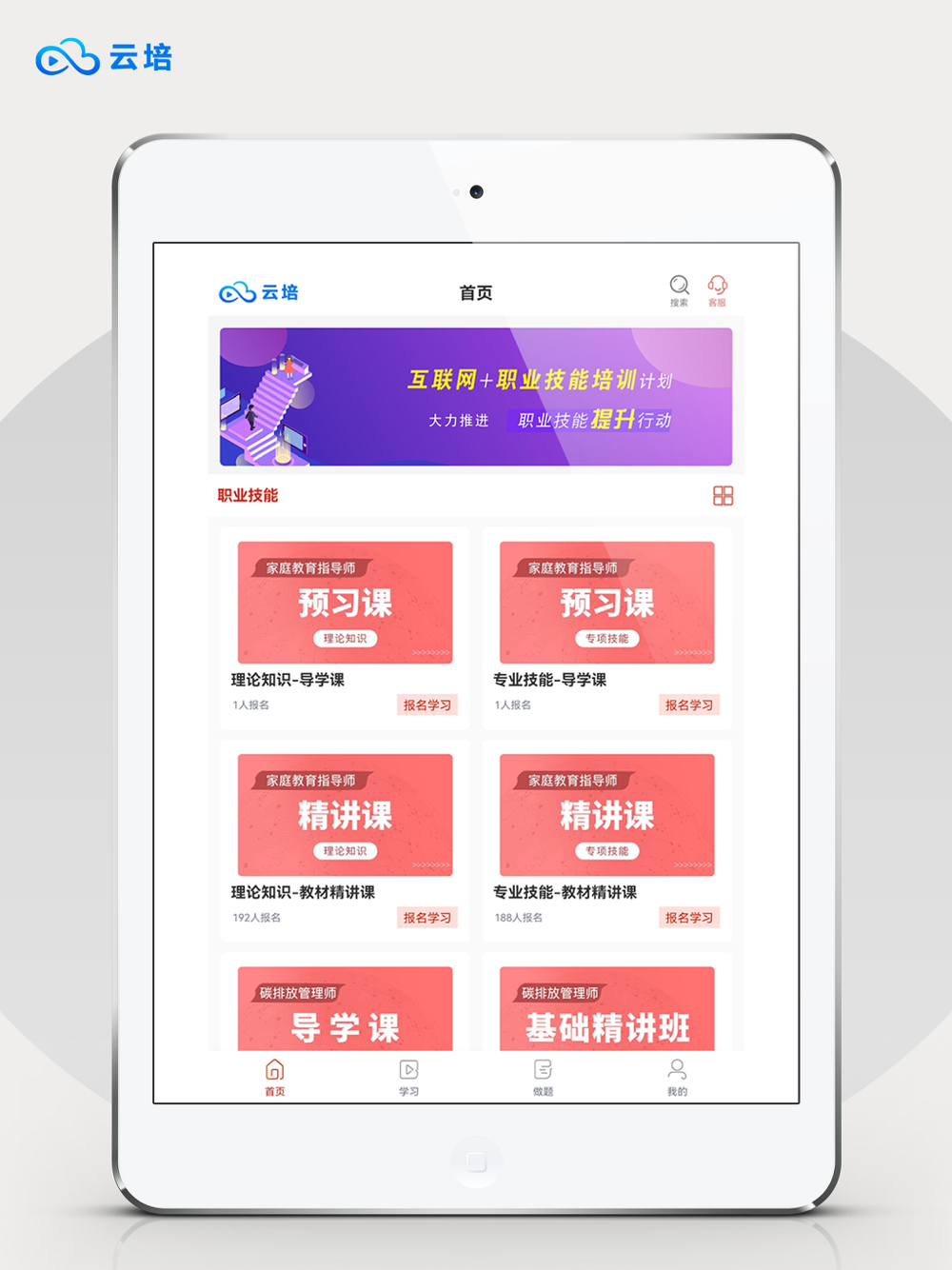 云培职业培训平台,专注于通用素质、生活服务、健康服务等各类技能培训在线培训平台,为机构赋能,为企业服务,用大数据构建全流程、可量化的职业培训高效服务体系。