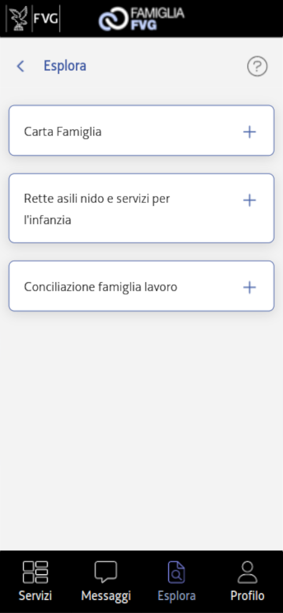 Famiglia FVG è un applicativo regionale che consente alle famiglie residenti in Friuli Venezia Giulia di richiedere i contributi loro riservati, consultare e gestire le domande presentate, prenotare un appuntamento con i servizi presenti sul territorio regionale. Attualmente i contenuti riguardano i seguenti servizi gestiti dalla Direzione centrale lavoro, formazione, istruzione e famiglia