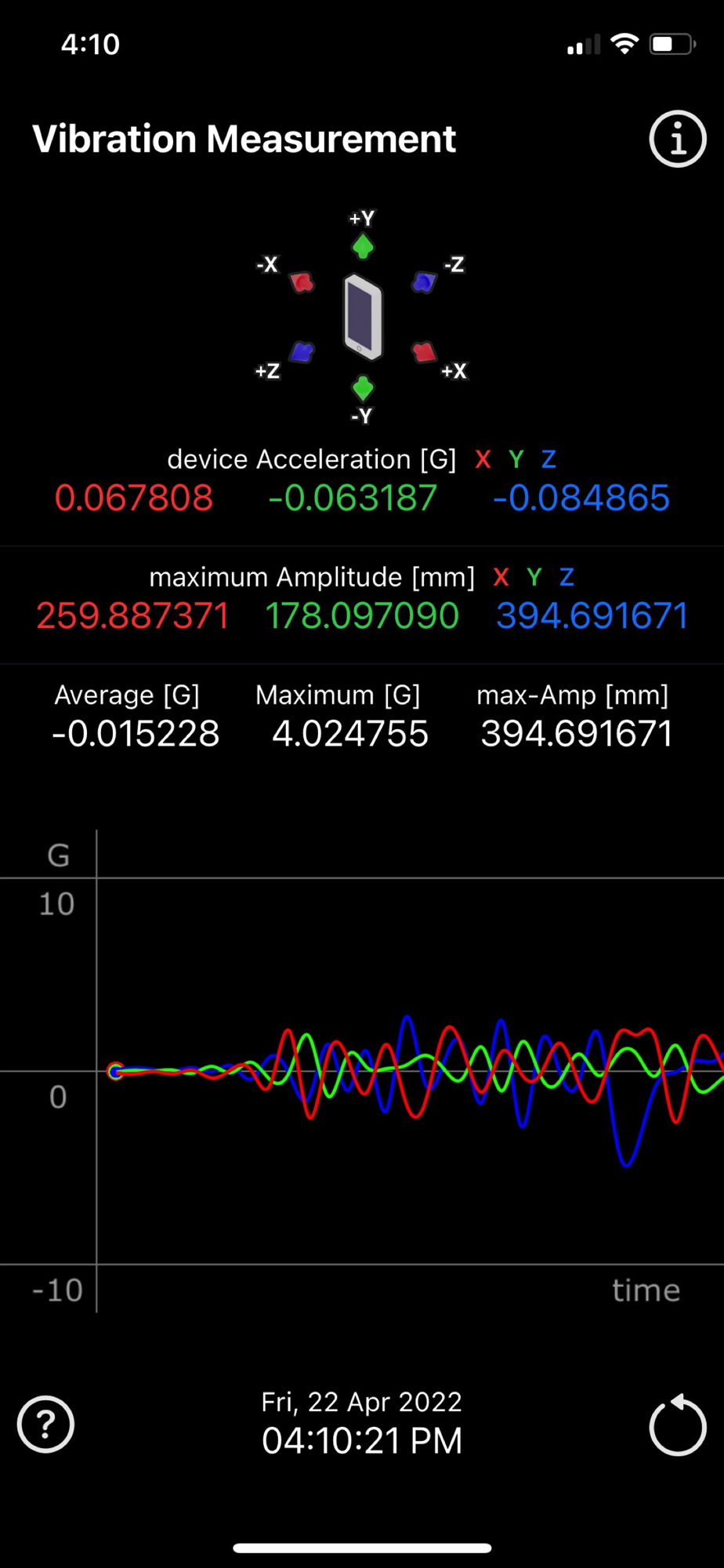 Vibration Measurement is device sensor log tool that enables you to monitor the vibration from your iOS Devices. You are able to preview the vibration data with graphs. Perfect for the casual user with user friendly UI.