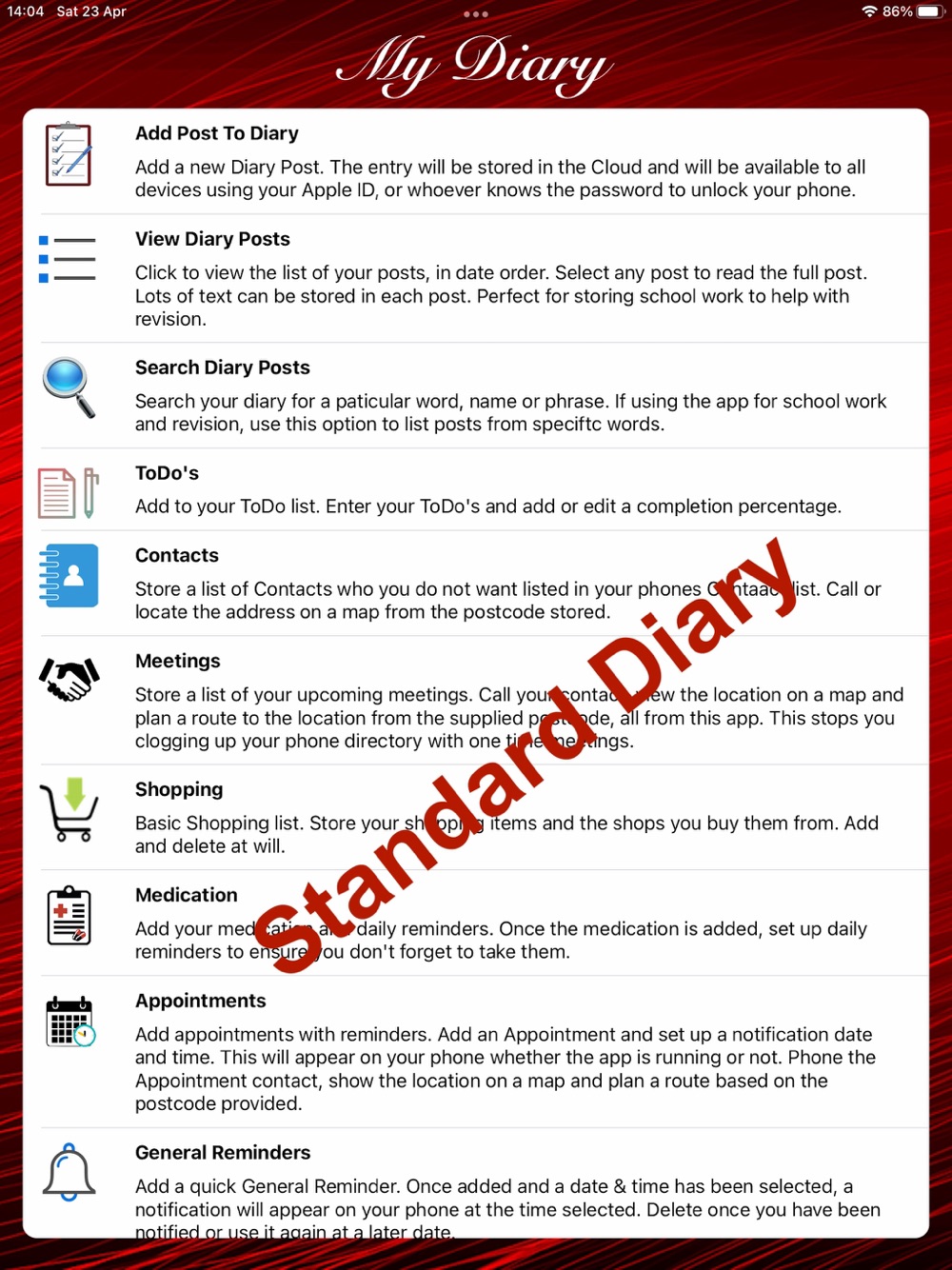 Standard Diary (Red background):