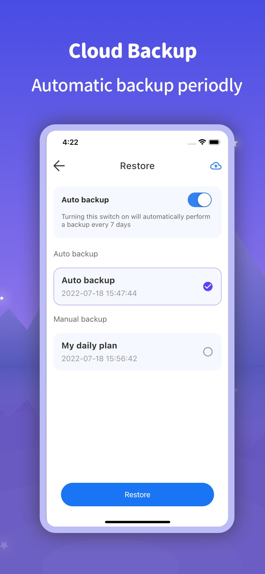 Turn on Regular automatic backup. App will automatic backup every 7days.