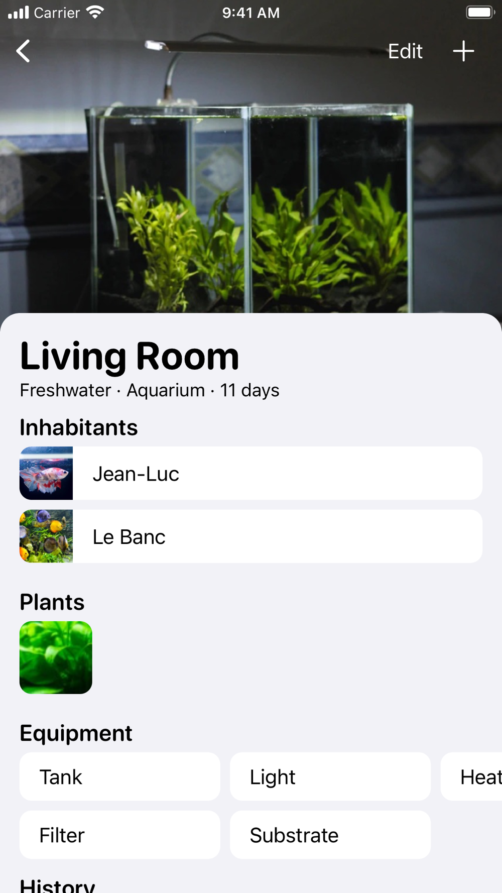 - Add a note (and an optional photo) daily to track daily tasks: feedings, observations, fish count, worries.