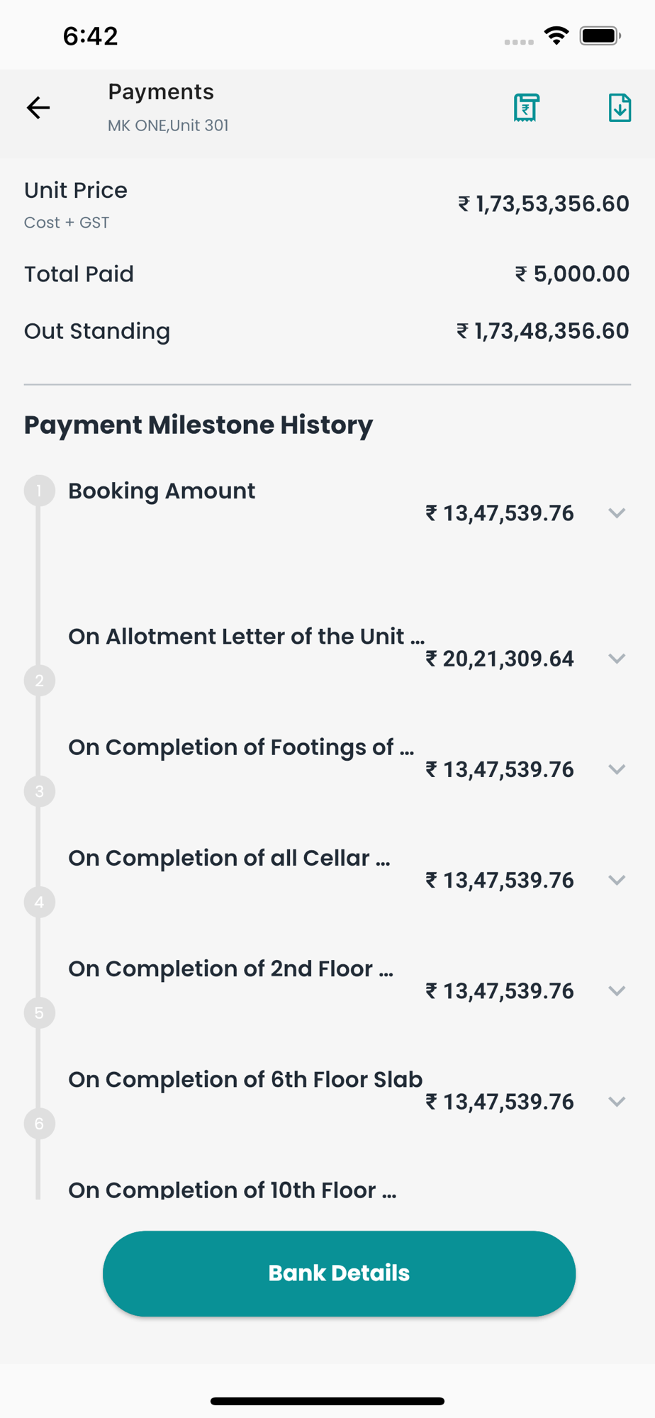 Clove Build Customer App - This will enable customers for one-stop information about all their investments with a specific real estate company. The investor or customer shall view the project progress & project-related documents like RERA approval & Legal documents, and brochures etc, payment history along with milestone details. Will have a glimpse of other projects for investors, their friends & family to explore investment opportunities.