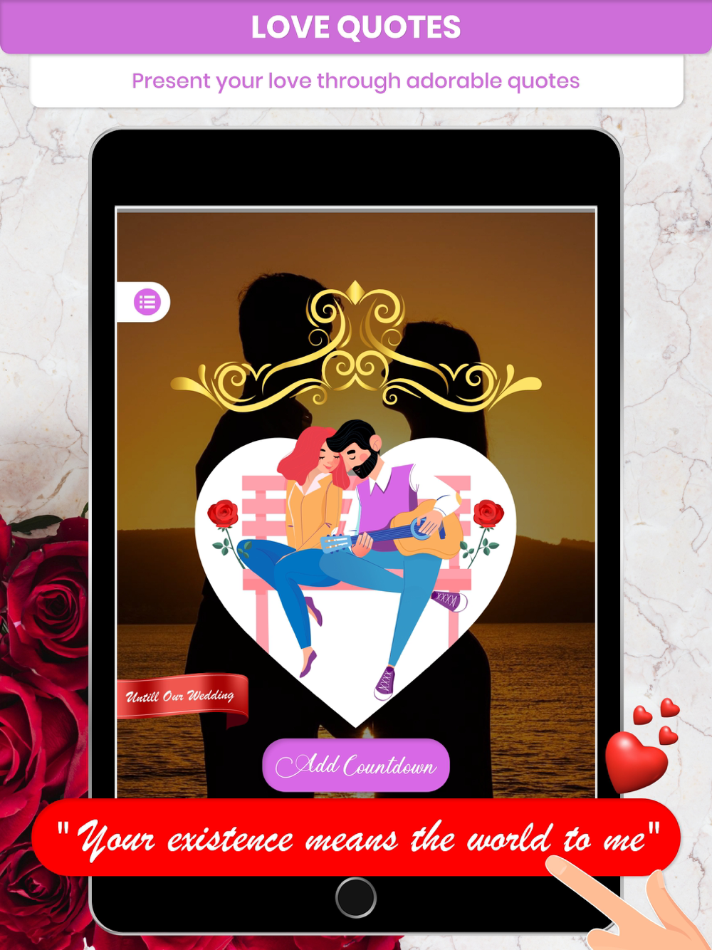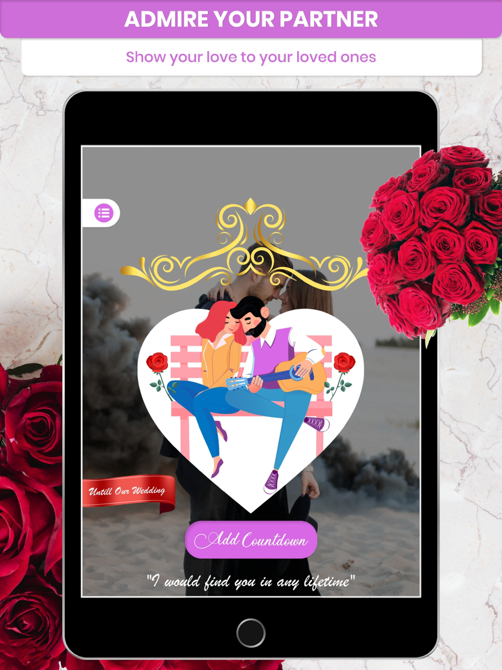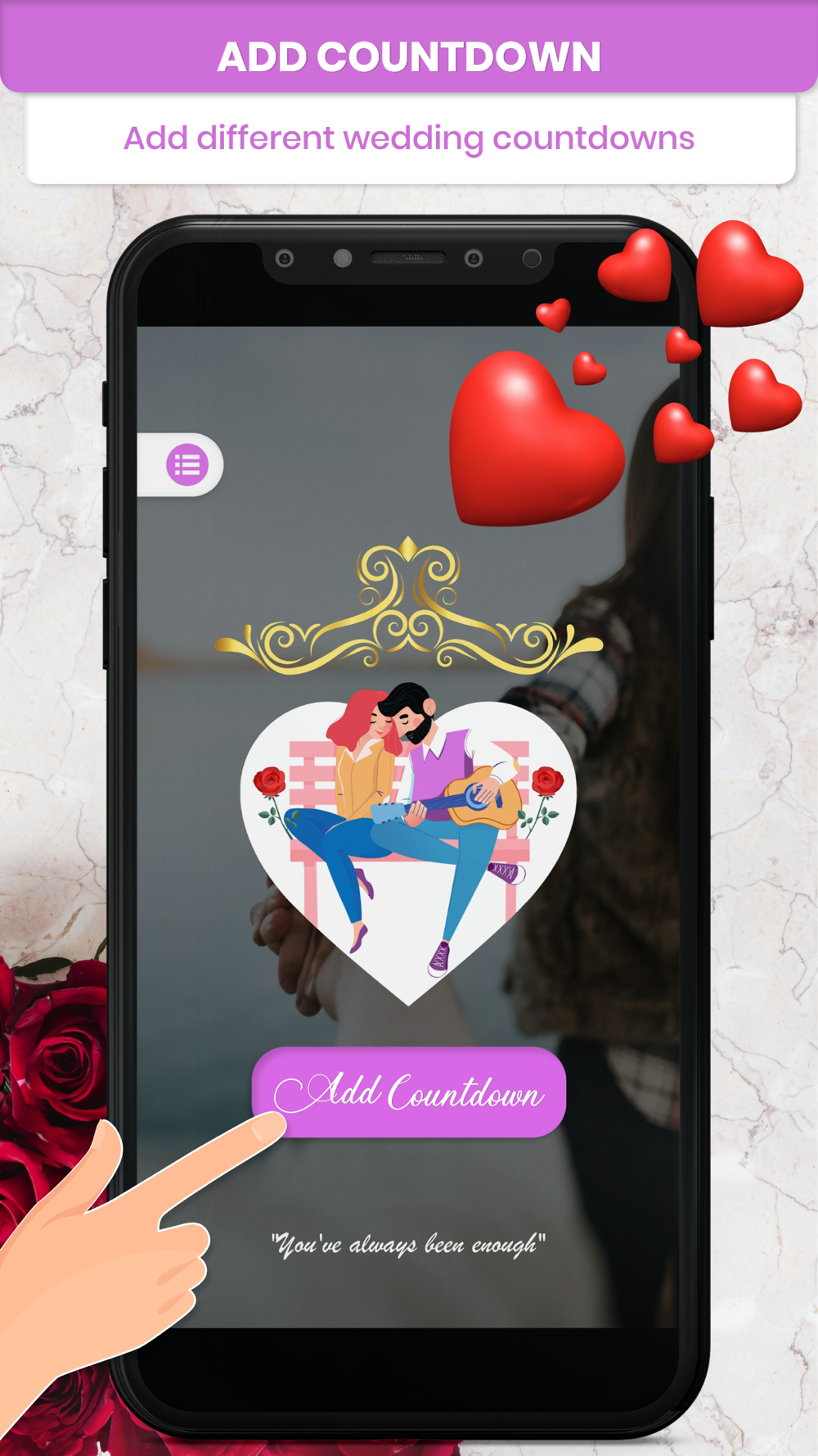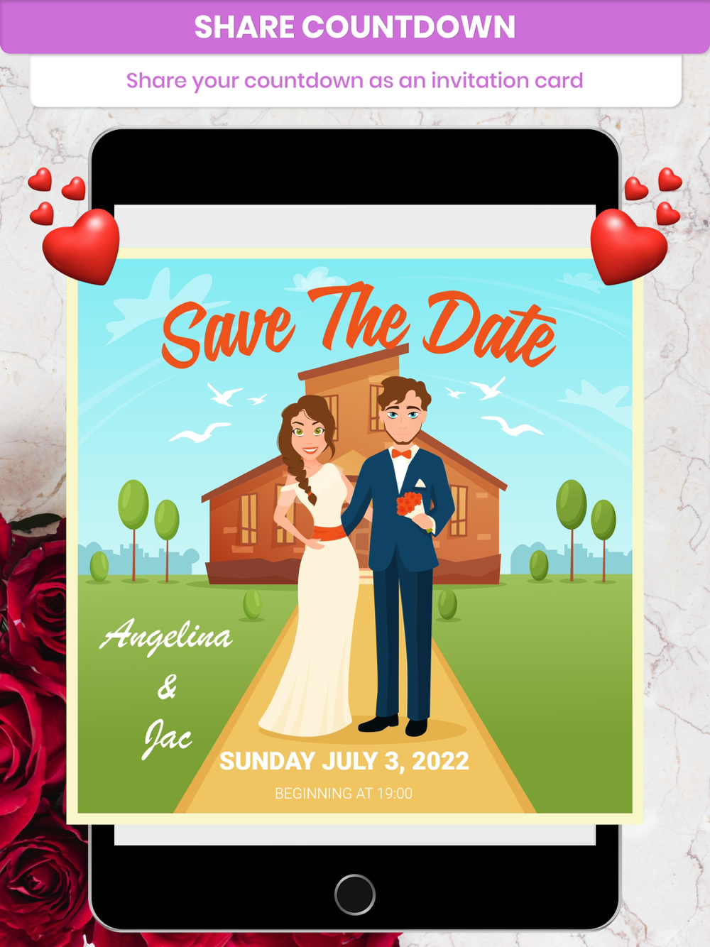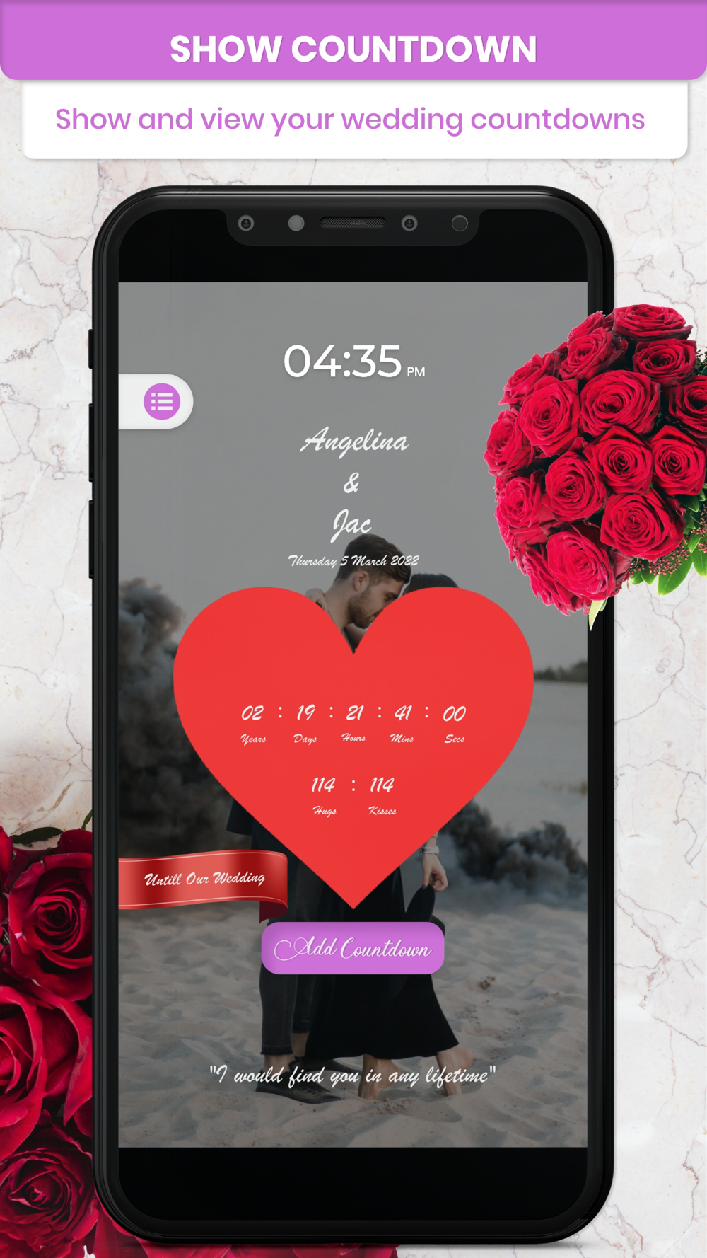 Wedding day reminder is the wedding app that will make you more excited for your big day by showing you the accurate time left. In the countdown to wedding day reminder app just enter the date of your big day. The wedding pro countdown app will calculate the time left in your big day. The wedding countdown timer will display the time on the mobile screen as a wedding widget.