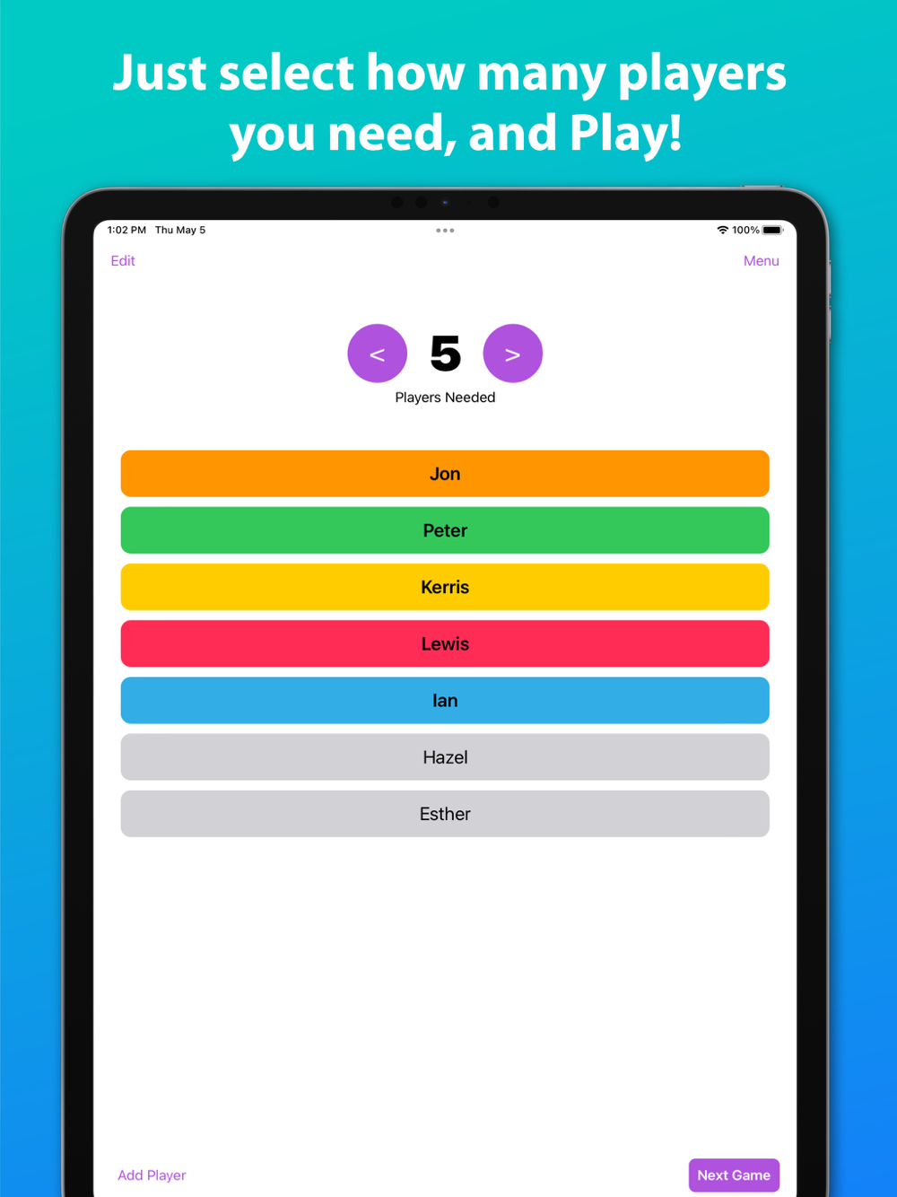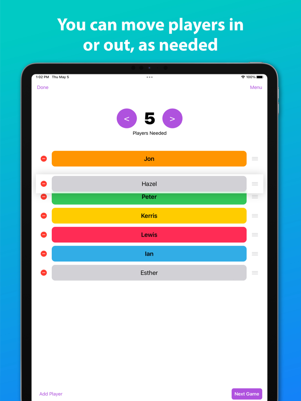 Enter the names of all your players, then select how many players you will need for the next game- the app knows how often each person has played, how long they've been waiting, and who has played against whom- then uses that to suggest who should play next.