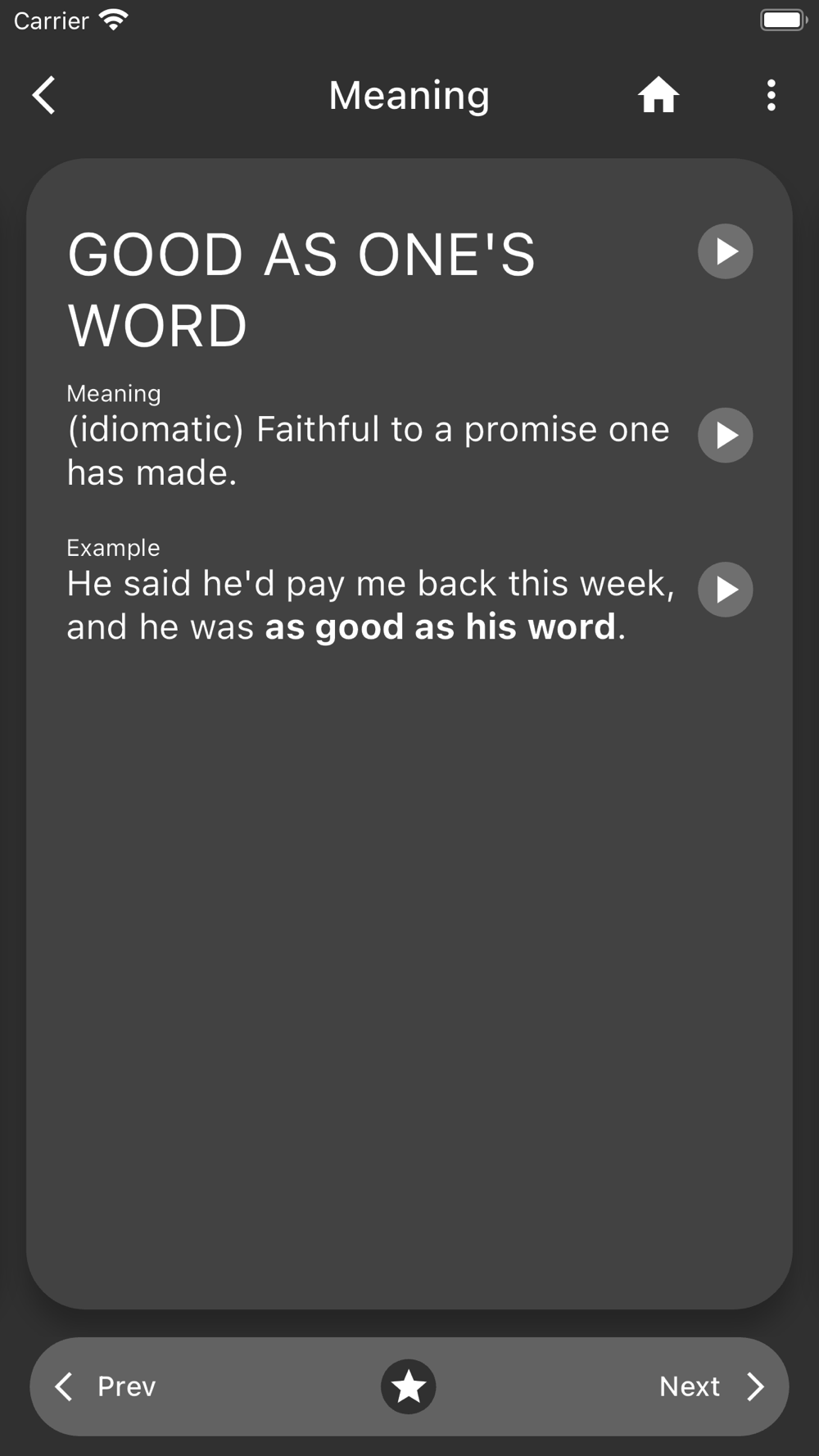 - Easy navigations (Next and Previous buttons) through idioms