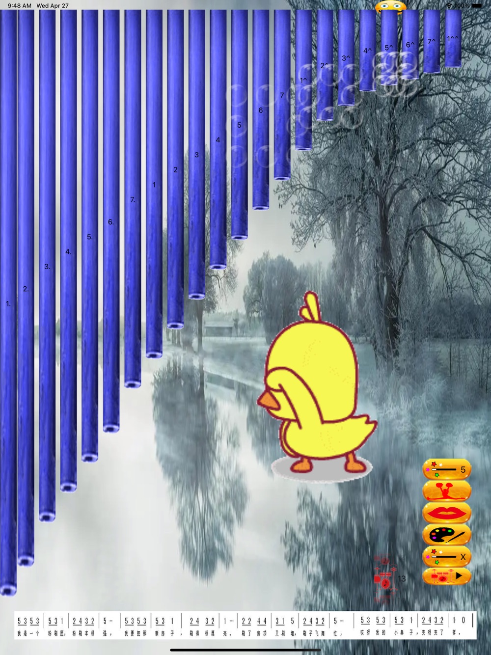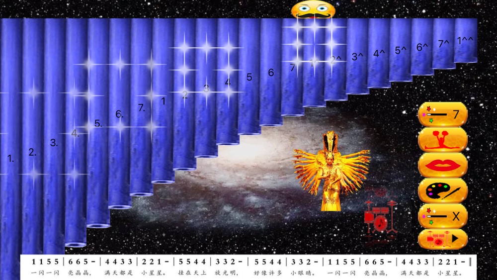 Button 1 on the right is to click the special effect, button 2 is to click the dance picture, button 3 is the upper lip picture, button 4 is to change the appearance color of the instrument, button 5 is to click the special effect, button 6 is to click the jazz drum accompaniment play / pause function, and the jazz drum picture on the left can scroll to select the rhythm type
