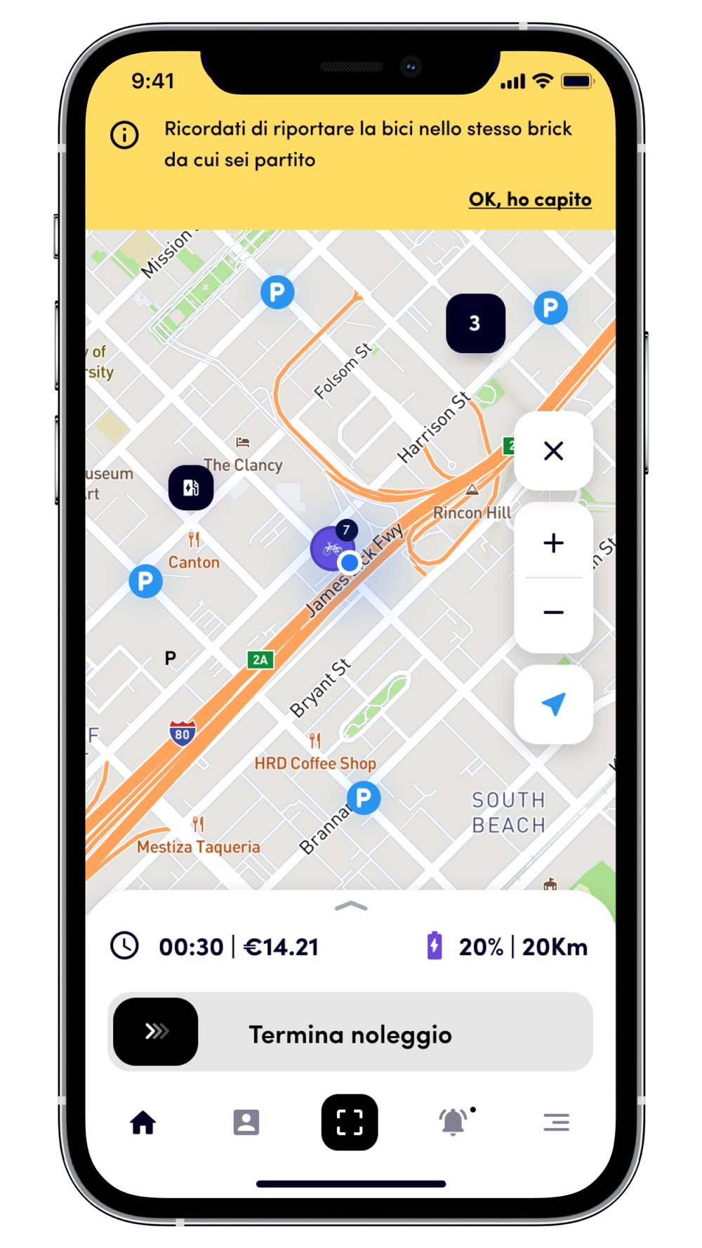 Riporta il veicolo dove lo hai prelevato. Ricorda che non potrai terminare il noleggio se non ti trovi nel posto giusto e se non avrai inserito il cavo di ricarica!