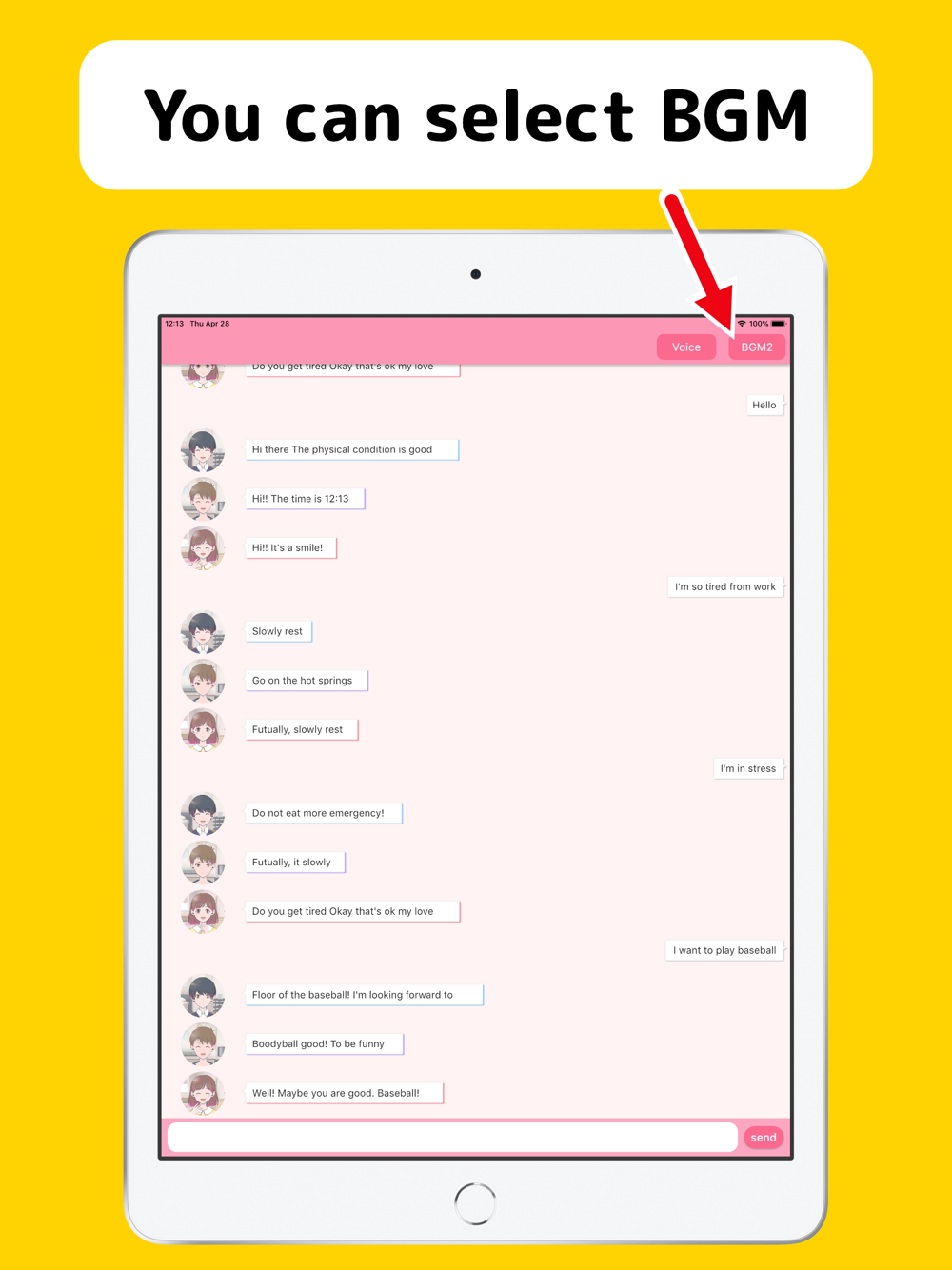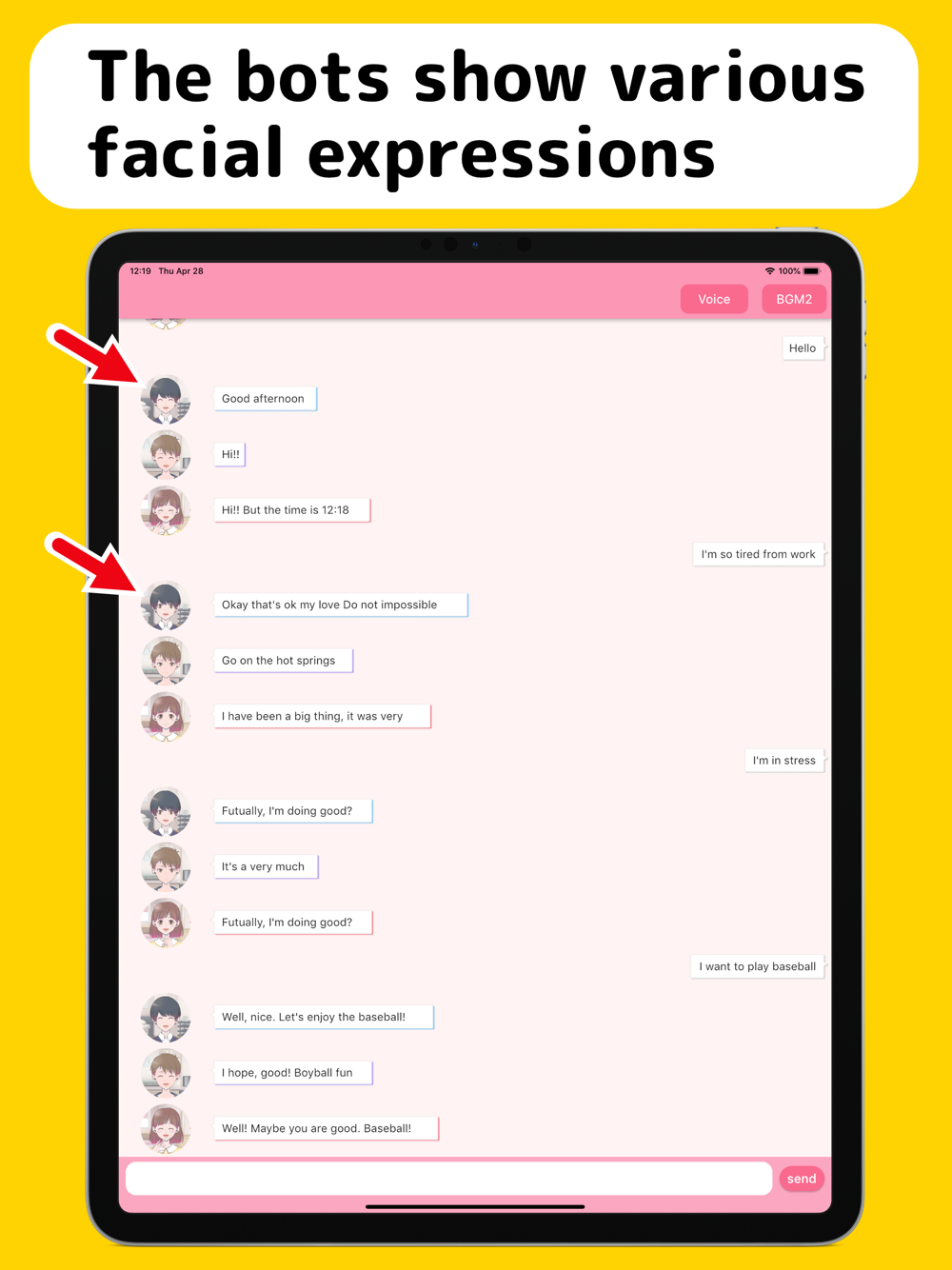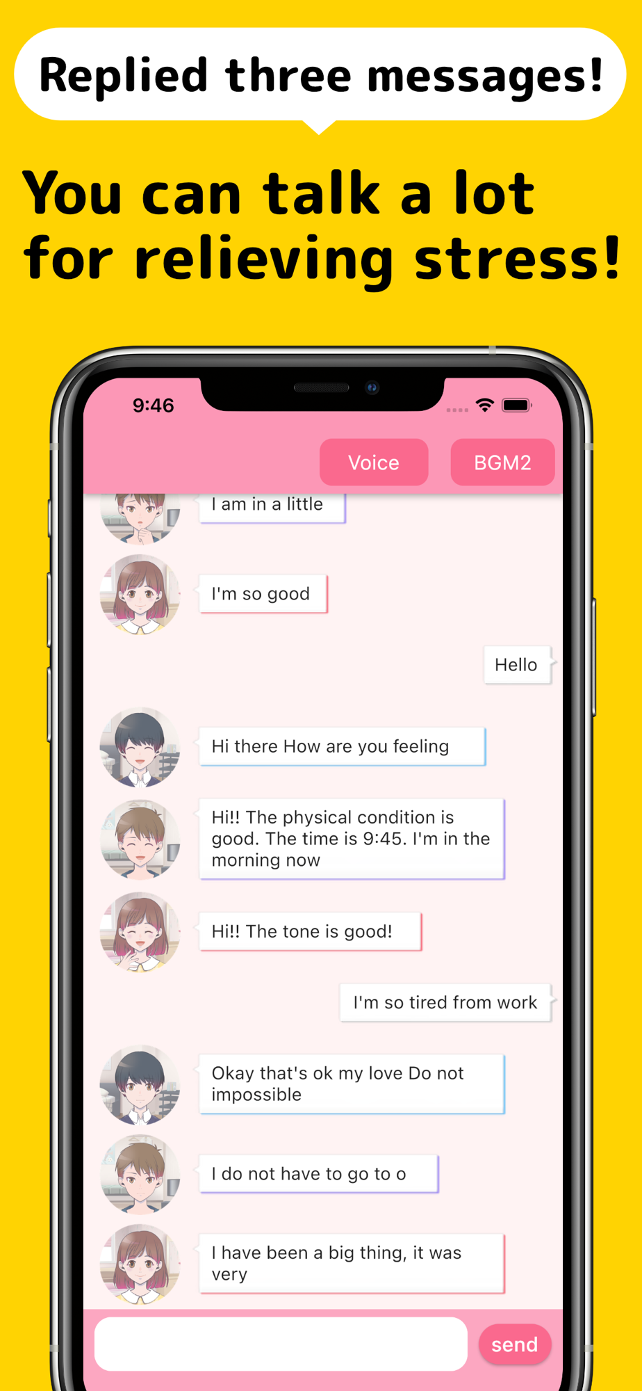 You can talk a lot, the bots reply all of your talk. They will listen not only your everyday complaints but also anything you can not say in real and on SNS.