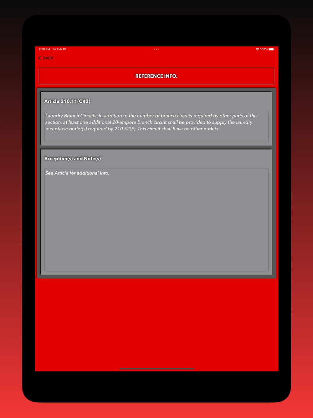 Richies app includes everything from tools for calculations to helping try to learn the code and calculation needed. It's an easy way to study for your upcoming exam. This app features multiple-choice answers, references, tables, calculation examples, tools for calculating the circuits by square footage, and service load calculator for a single family dwelling with general appliances, and information notes that guide you where to look in the codebook. This app has been developed to try to help those in the field with tools and those ready to take the next step in their career with study material with examples.