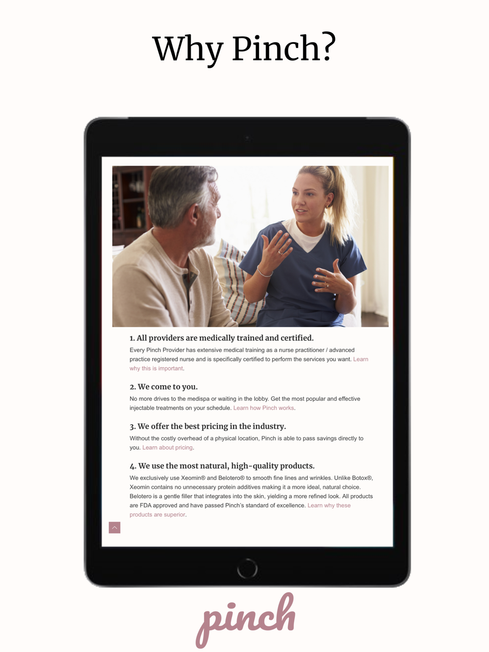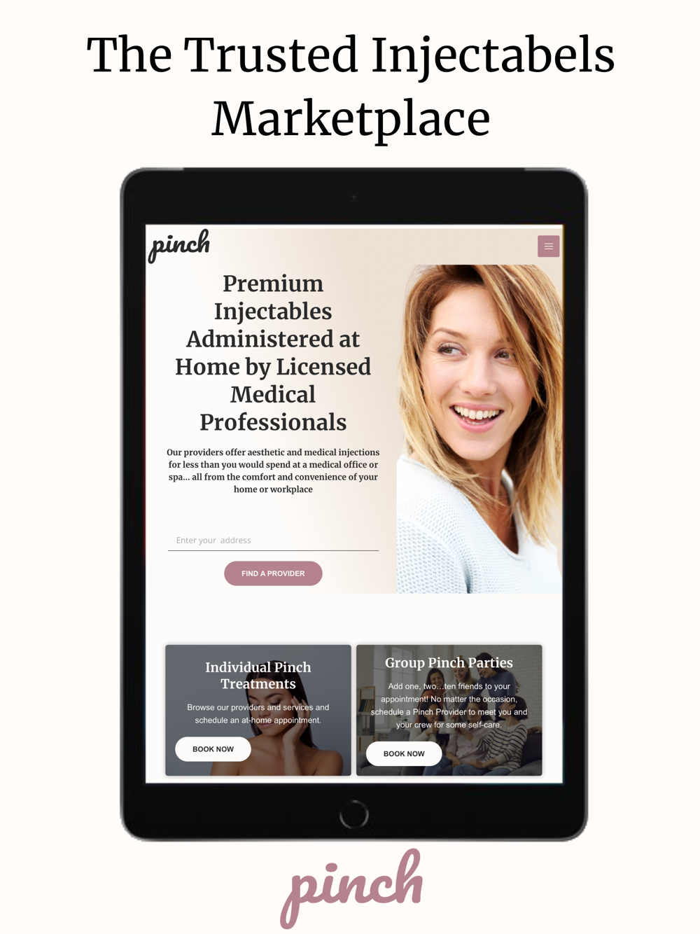 Pinch is disrupting the cosmetic injectables landscape by offering the highest-quality aesthetic injectables delivered conveniently in the comfort of home. Pinch Providers are all medically trained and licensed nurse practitioners / advanced practice registered nurses and is specifically certified to perform the services you want.. Our natural, high-quality products are designed to smooth fine wrinkles and keep you looking your best!