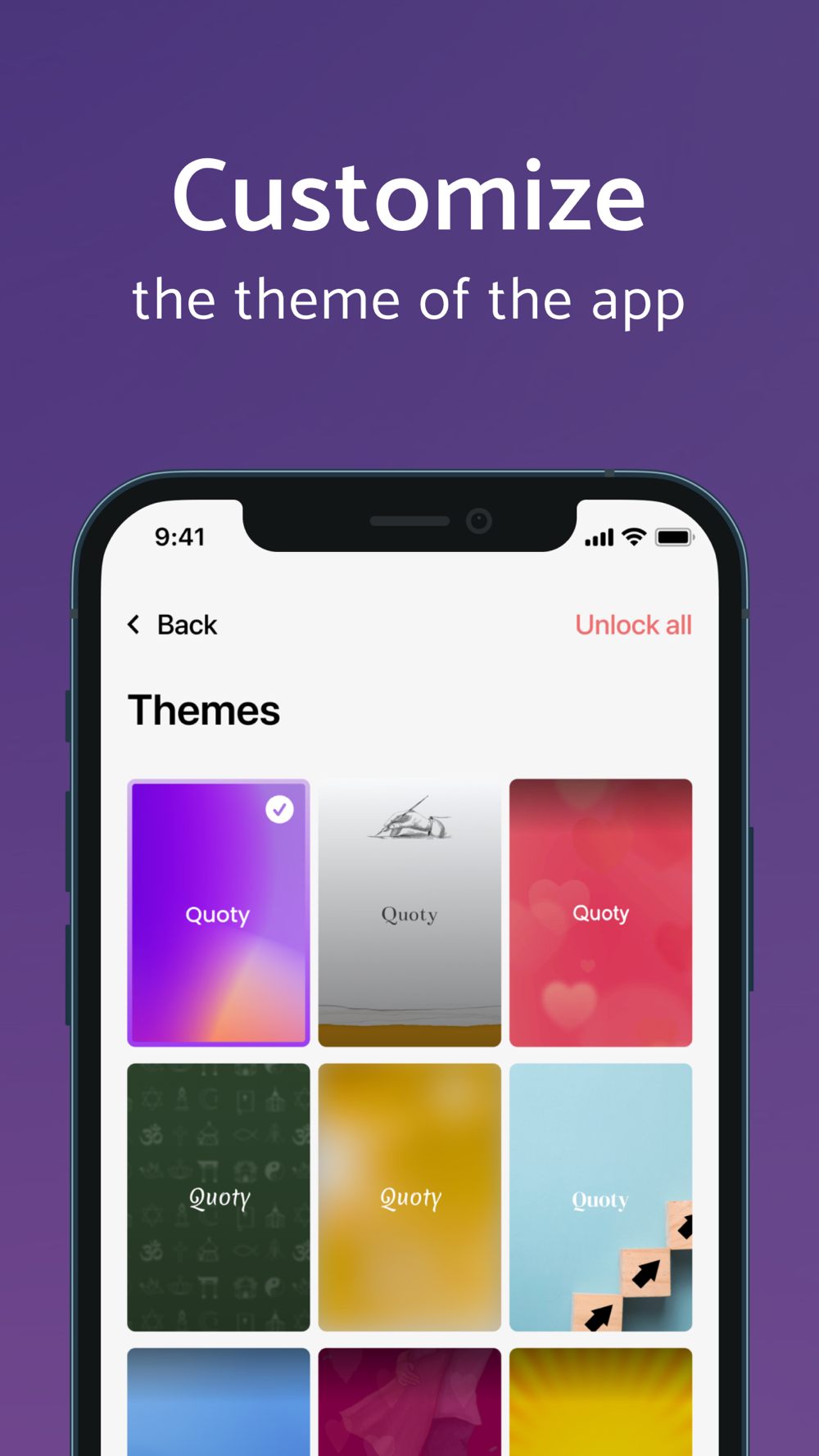 From a variety of topics, choose those you want to focus on. The app includes a wide range of topics such as love quotes, religion, success, humor, words of wisdom, motivational, daily inspiration quotes, life quotes, encouraging word, mental health quotes, self motivation (and many more), as well as a selection of carefully designed themes to choose from - updated frequently.