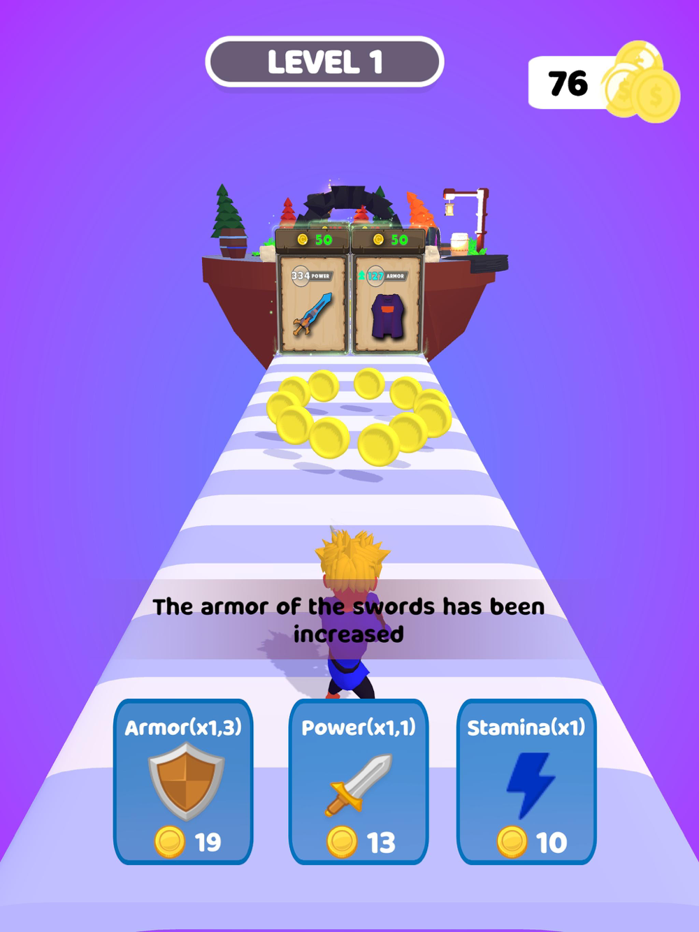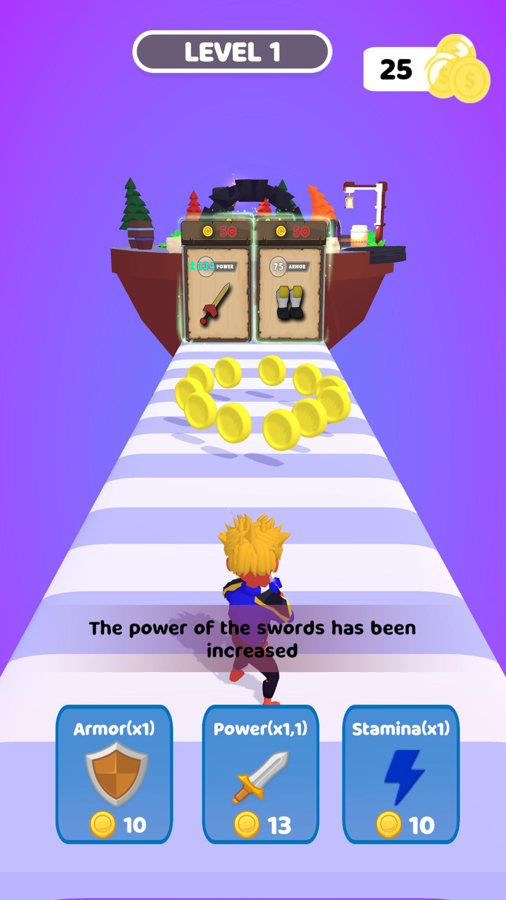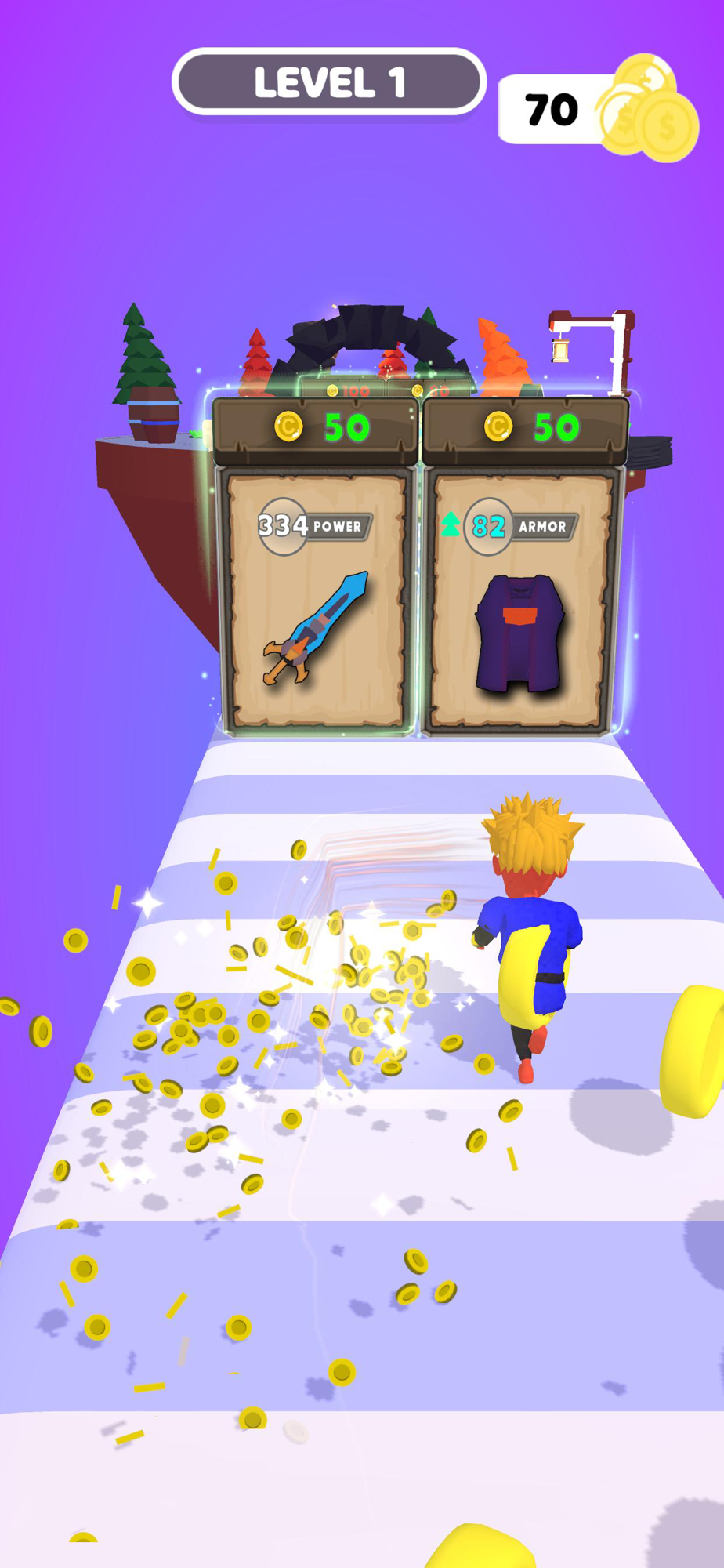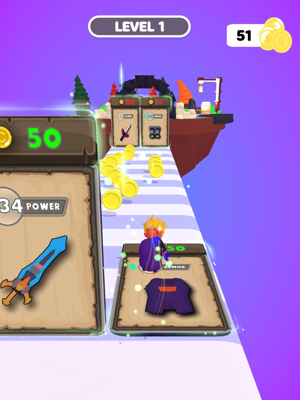 Run and choose a card according to the features and equip it. Reach the final with the best equipment and slay the monsters.Get as much gold as you can and try to upgrade your features. This makes it easier to kill creatures.
