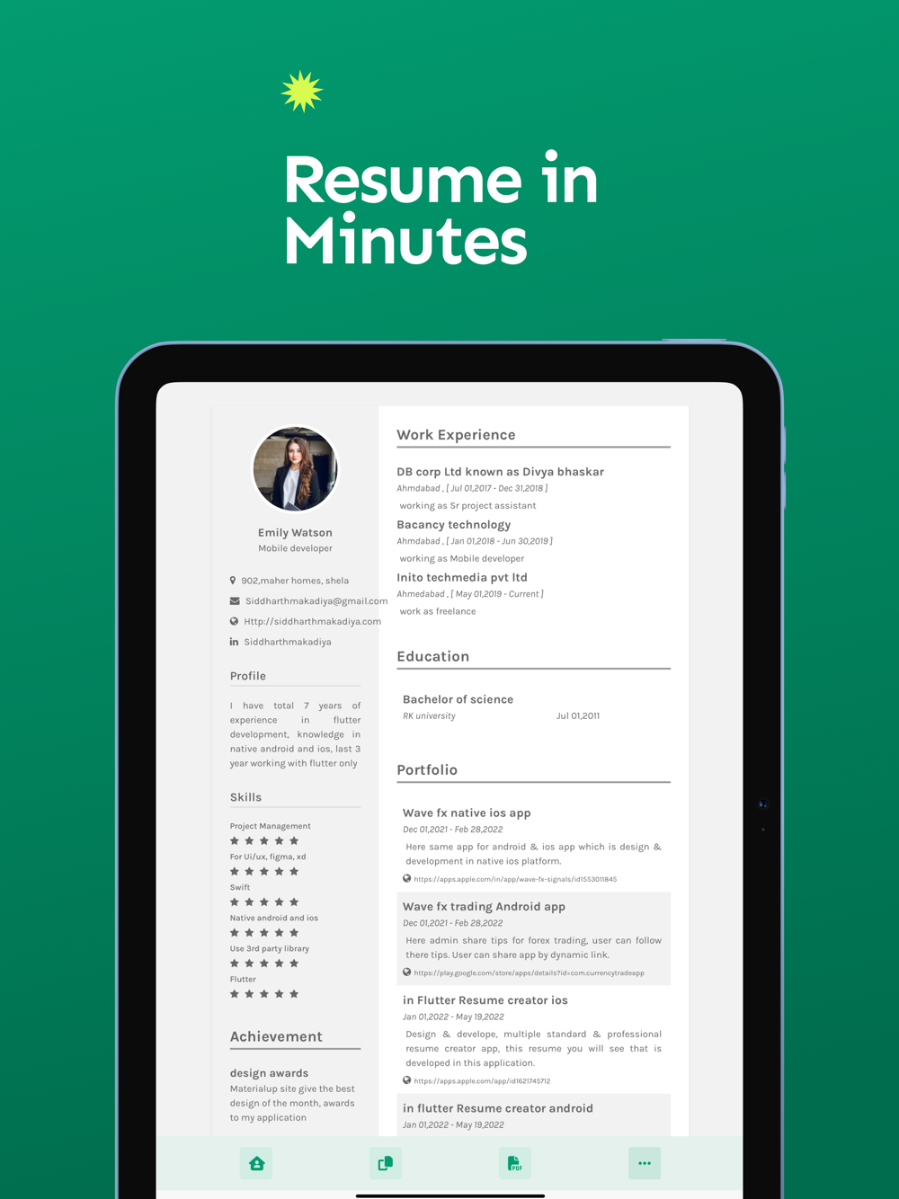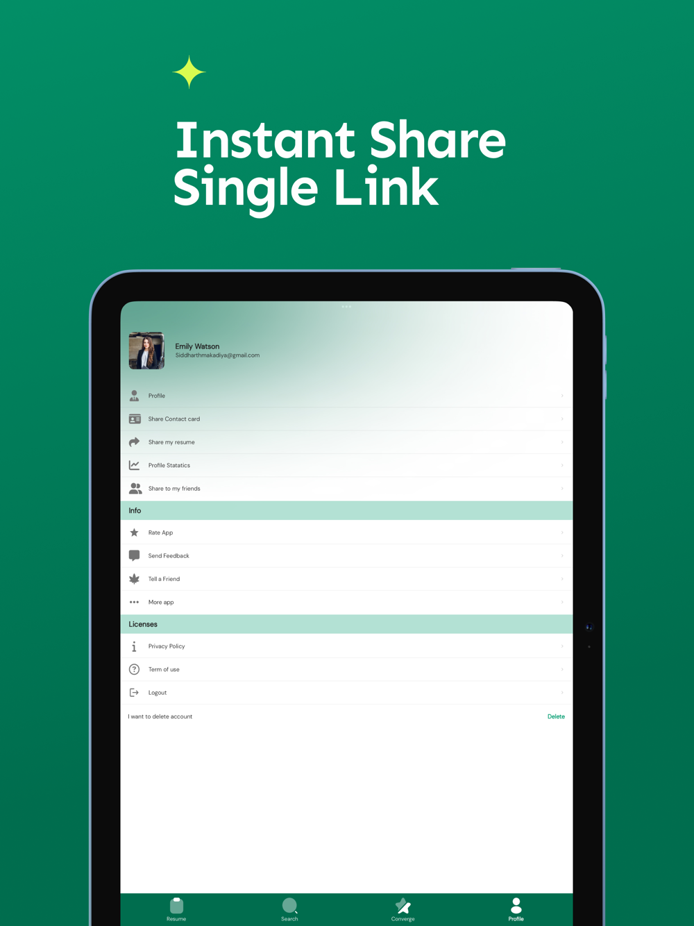 - Share your resume instantly with a single tap, as a PDF or via a single link, to make a lasting impression.