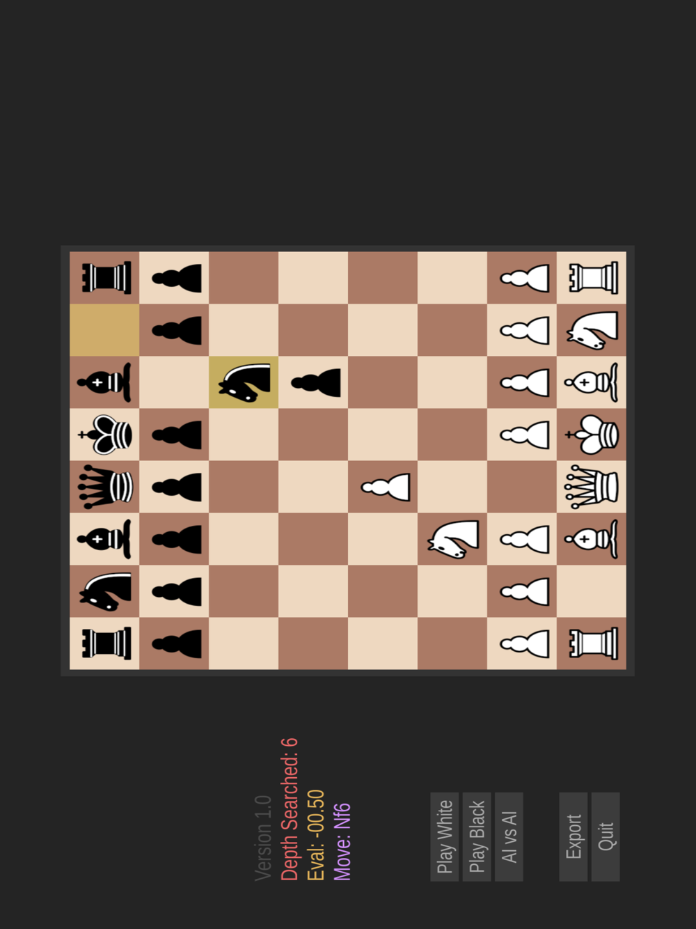 Classic Chess Game. Play against AI as black or white. Watch the AI play against itself.