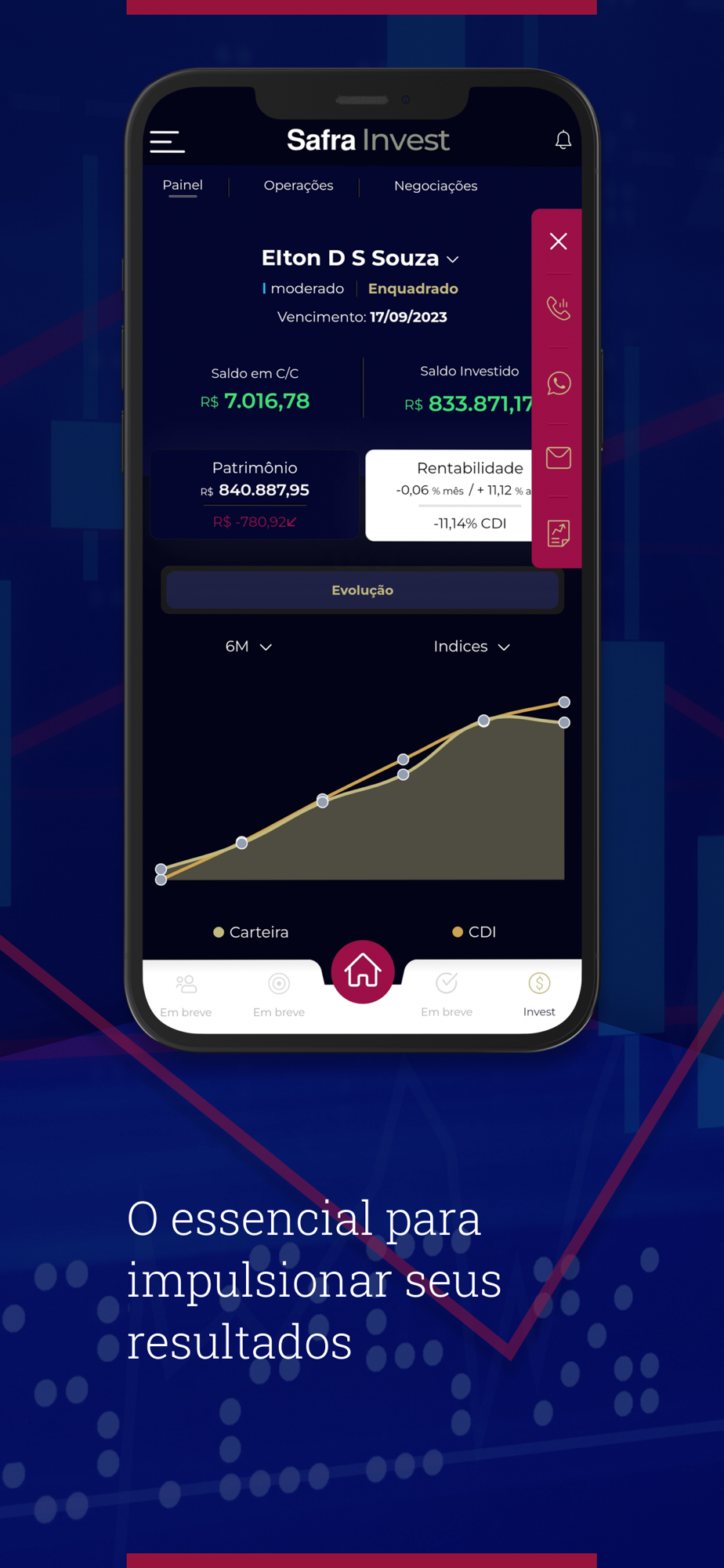 Conte com um sistema integrado para apoiar a prospecção de clientes, permitindo o acompanhamento direto pelo App Safra Invest, desde a abertura de conta pelo cliente.