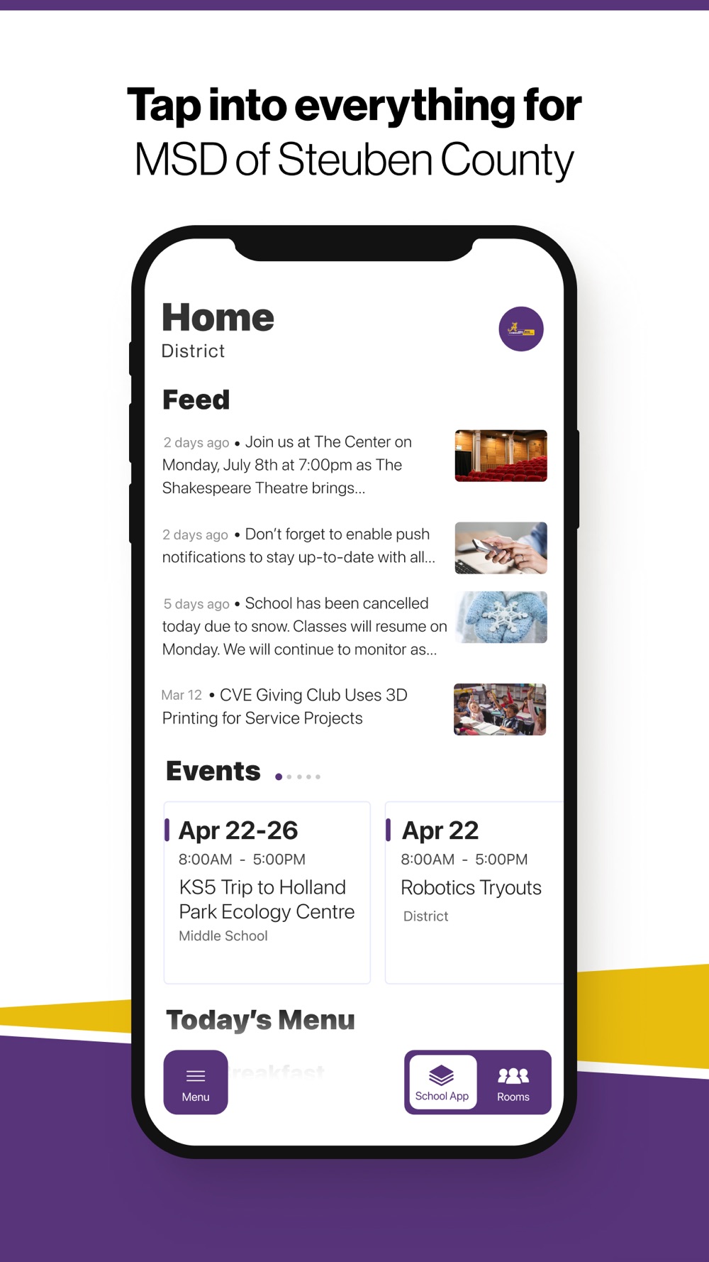 The event section shows a list of events throughout the district. Users can add an event to their calendar to share the event with friends and family with one tap.