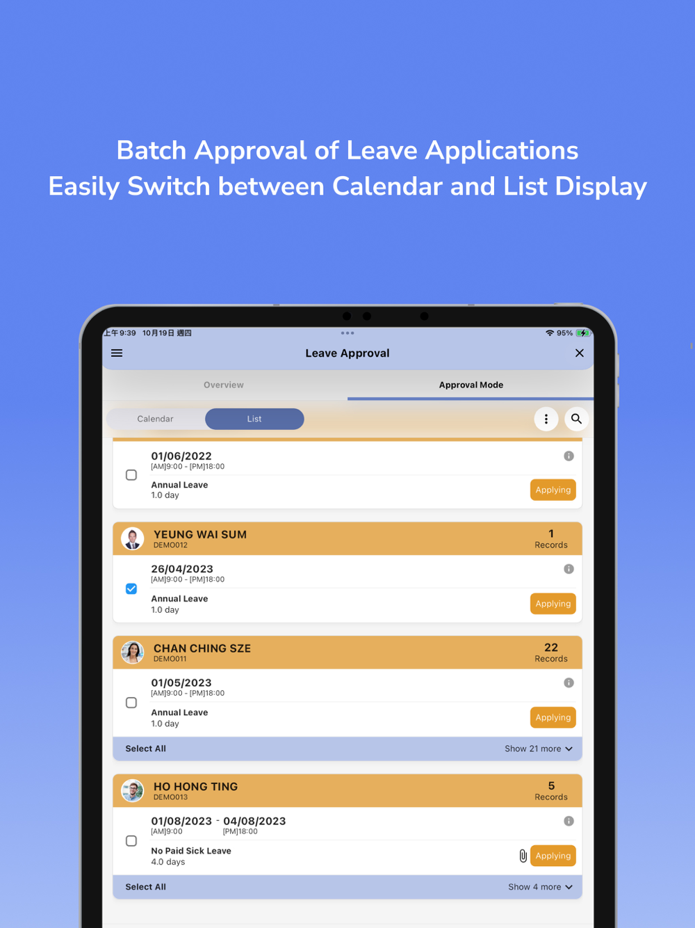 Leave Management: submit/cancel/revise leave application for approval and generate leave calendar