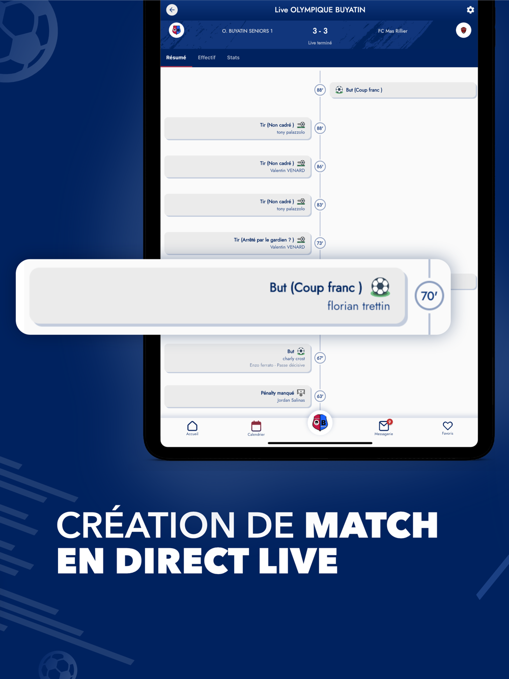 Passez à la vitesse supérieure et diffusez vos matchs en direct, comme les pros ! Grâce à SportCorico, vous pouvez saisir en direct les différentes actions du match : buts, passes décisives, tirs, corners, fautes, cartons & même les changements.