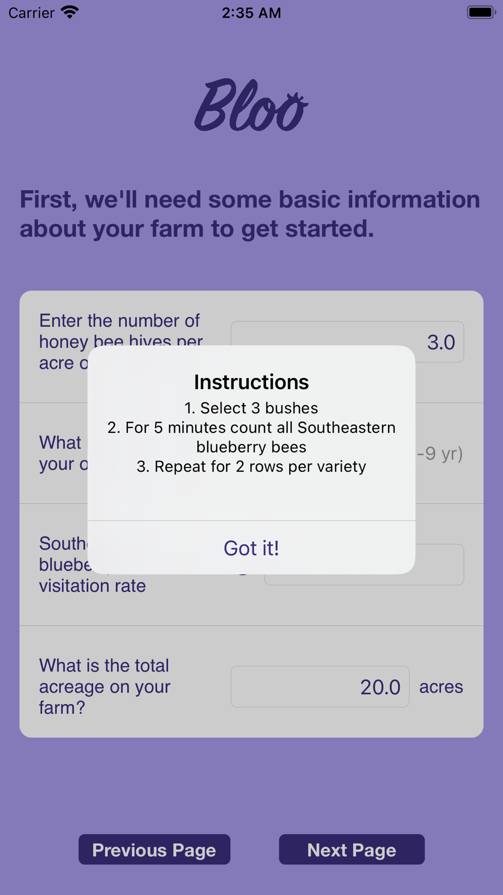 Introducing BLOO: Blueberry Farm Helper. One of the first apps of its kind to help Georgia blueberry farmers calculate expected profits from the palms of their hands. BLOO is fully interactive so farmers can adjust factors such as costs and acreage to help them find what works for them.