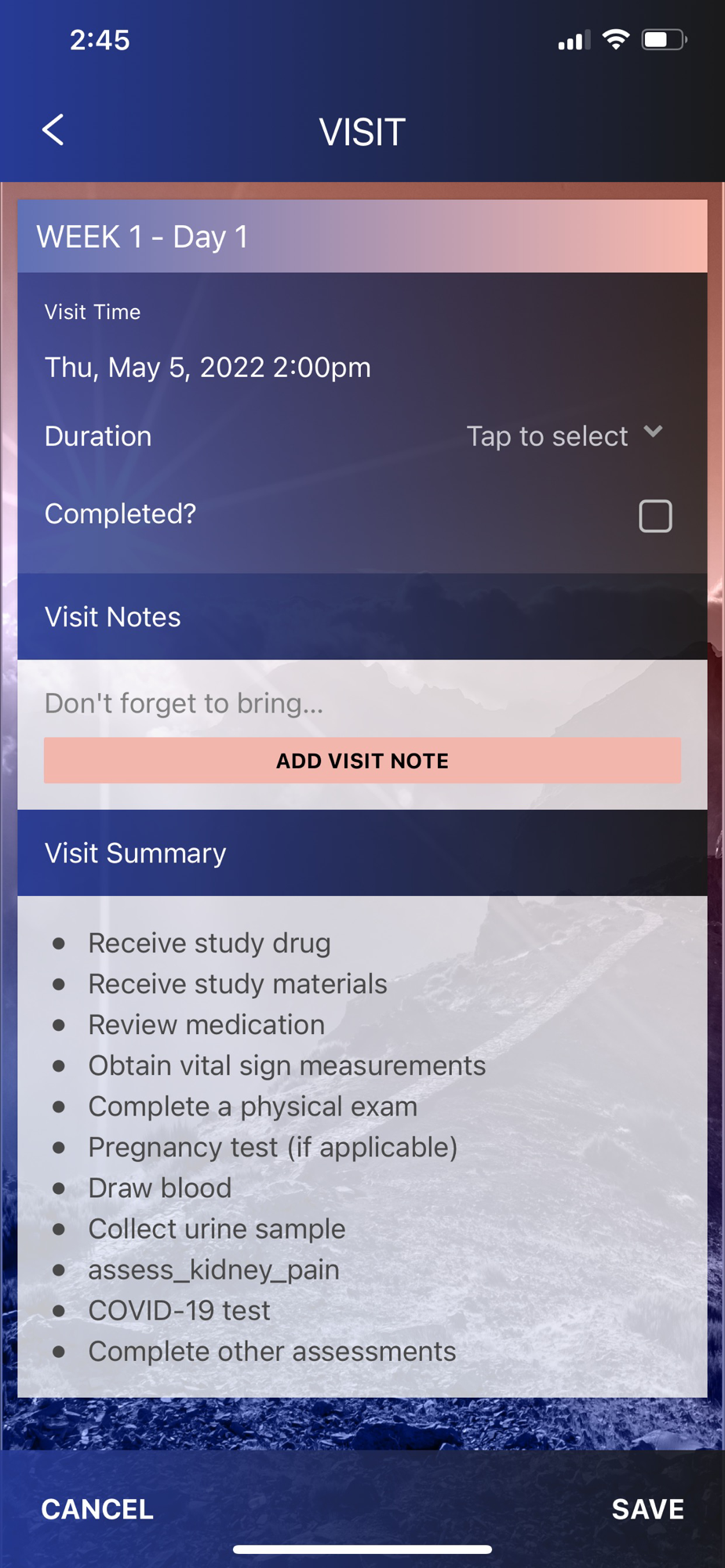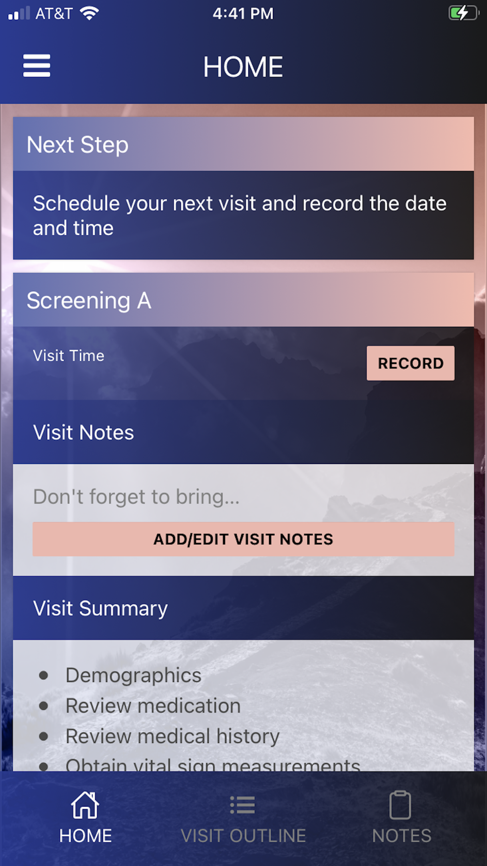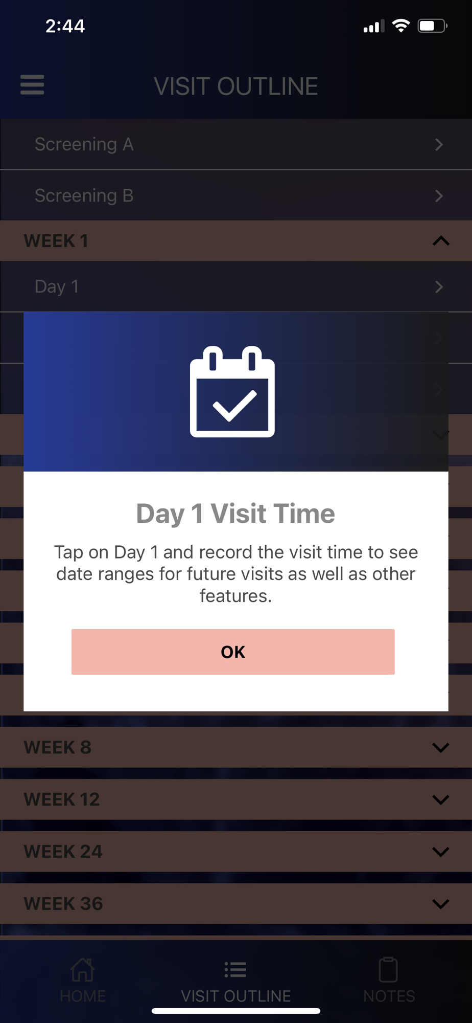 • VISIT OUTLINE - Provides a visit outline with dates so you know what assessments to expect at each visit