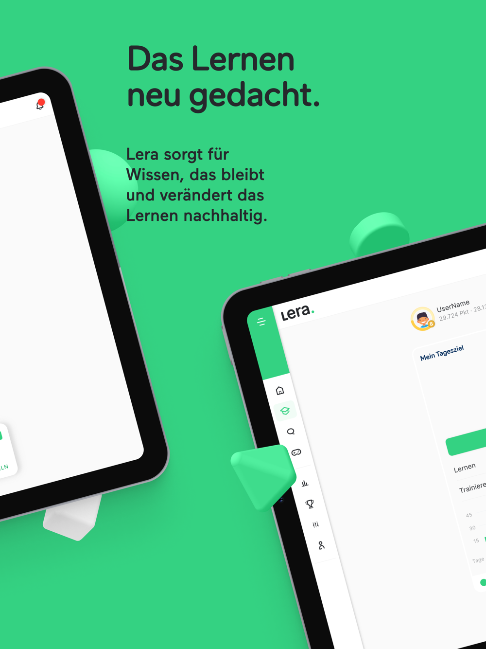 Lera generiert für jede/n User:in einen individuellen Lernplan – je nachdem, wie viel Zeit man sich nehmen will oder welche Lernmethoden man bevorzugt. Innerhalb von Micro-Learning-Einheiten wird das Wissen schlüssig vermittelt und im Rahmen von Spaced Repetition eingängig wiederholt.