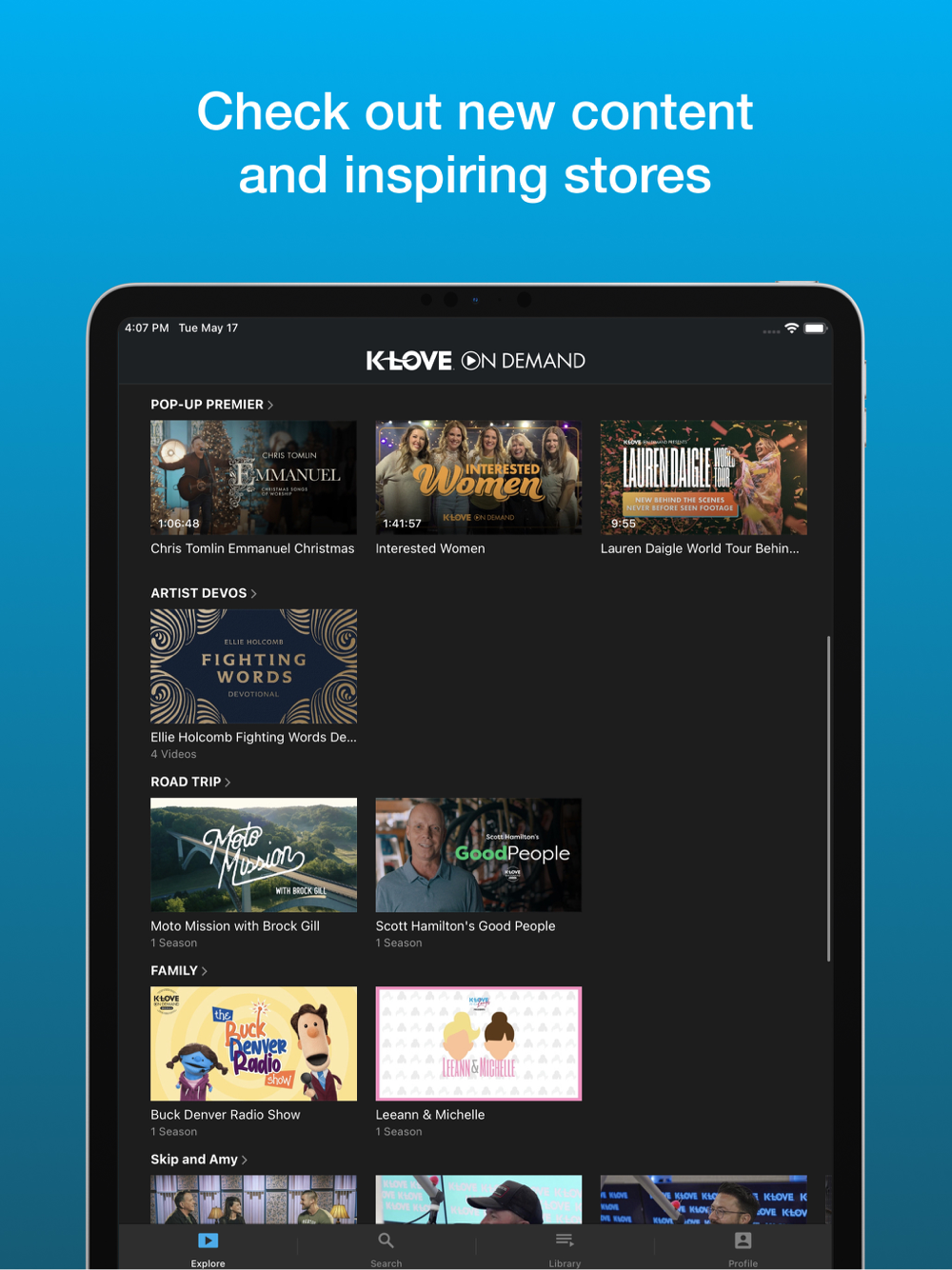 K-LOVE On Demand! Positive and encouraging content that brings you closer to the music! In-depth artist interviews and thoughtful devotionals reveal their hearts and motivation- their love for Jesus! Fun lifestyle adventures with your favorite artists include cooking, travel and more.