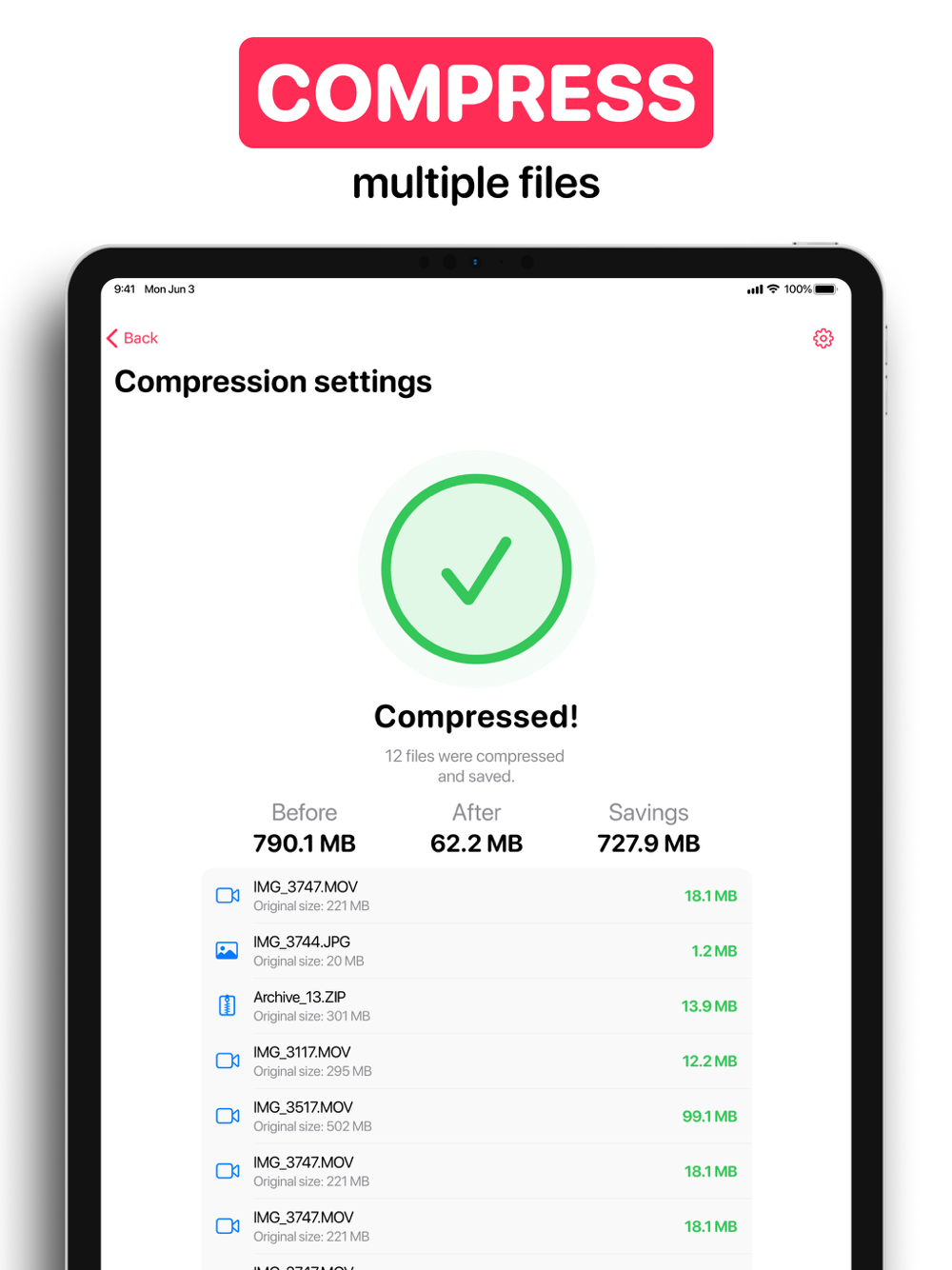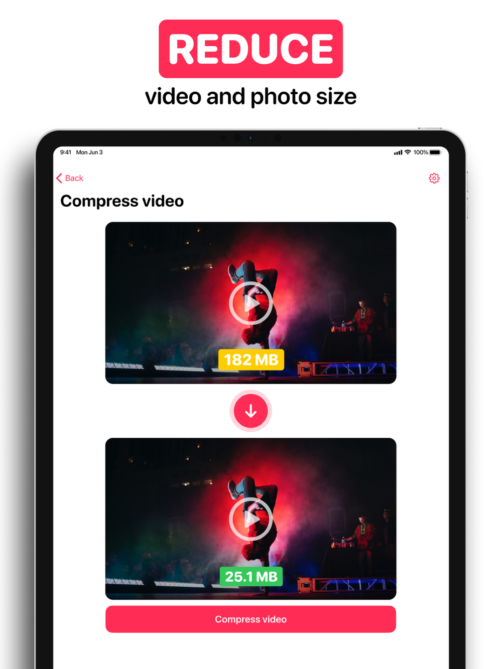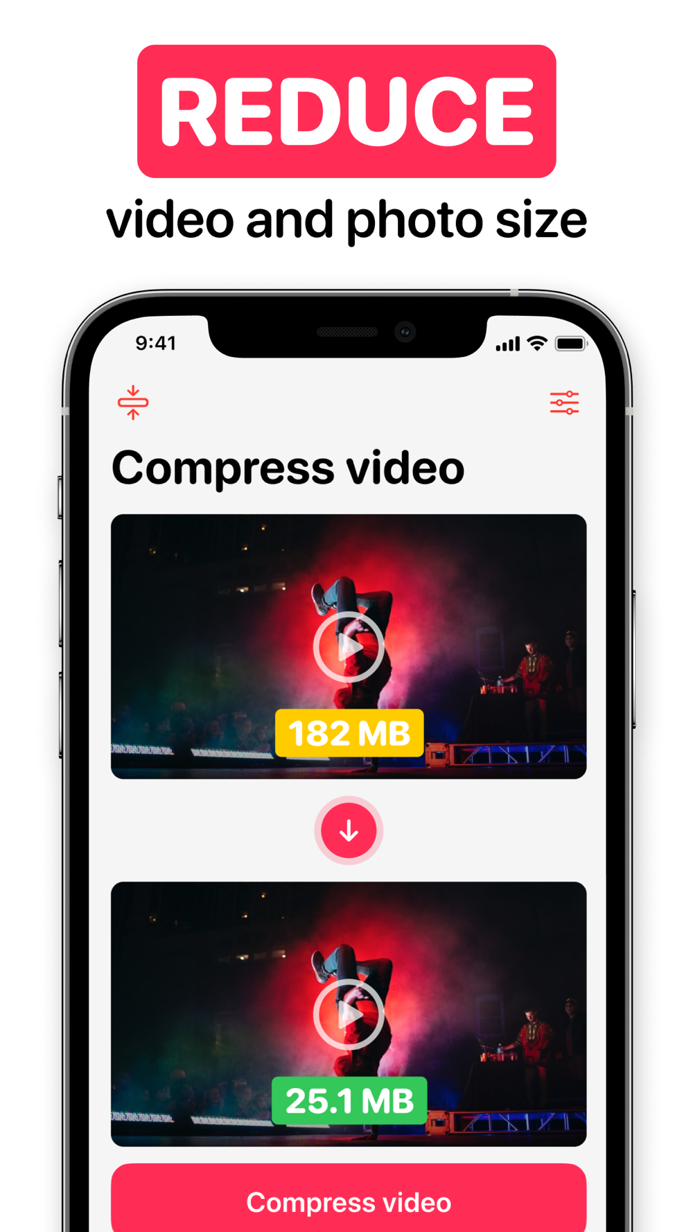 Video & Photo Compressor will solve your problem. Compressing video with Video & Photo Compressor app is very easy. Just add your video and photo to the app, specify the compression level and save the finished product!