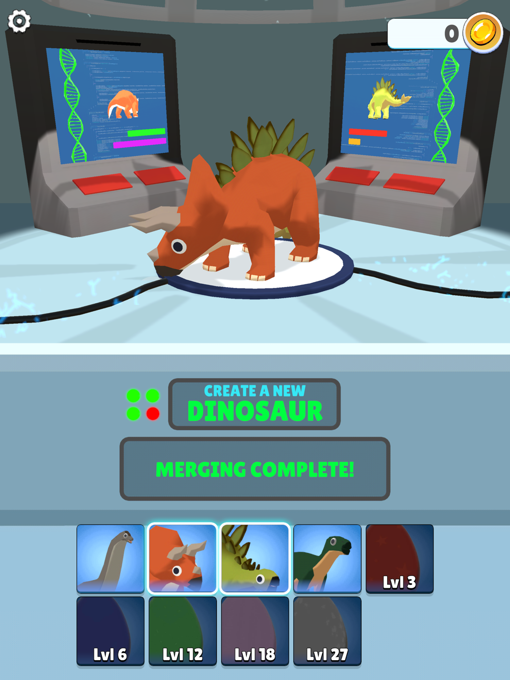 You're a mad scientist, playing God. Mixing DNA of dinosaurs together to create new super dinosaurs. Merge them together to add the best of both dinos, then take your monstrosities out to battle.