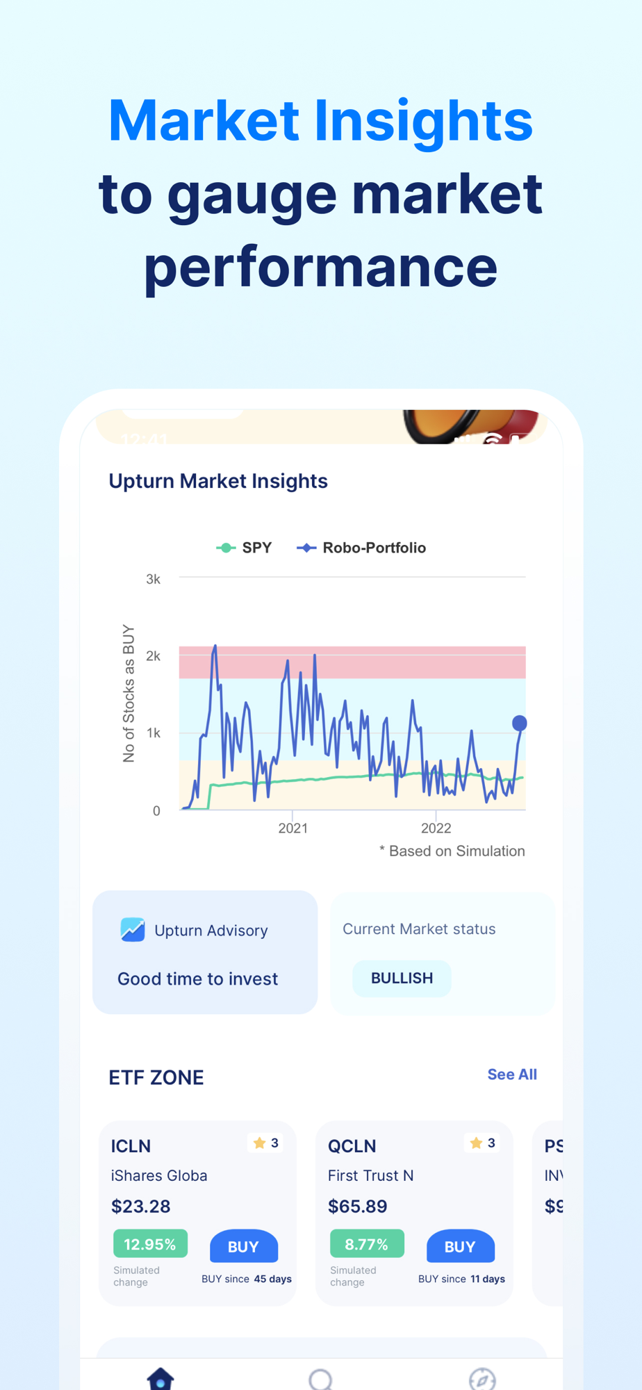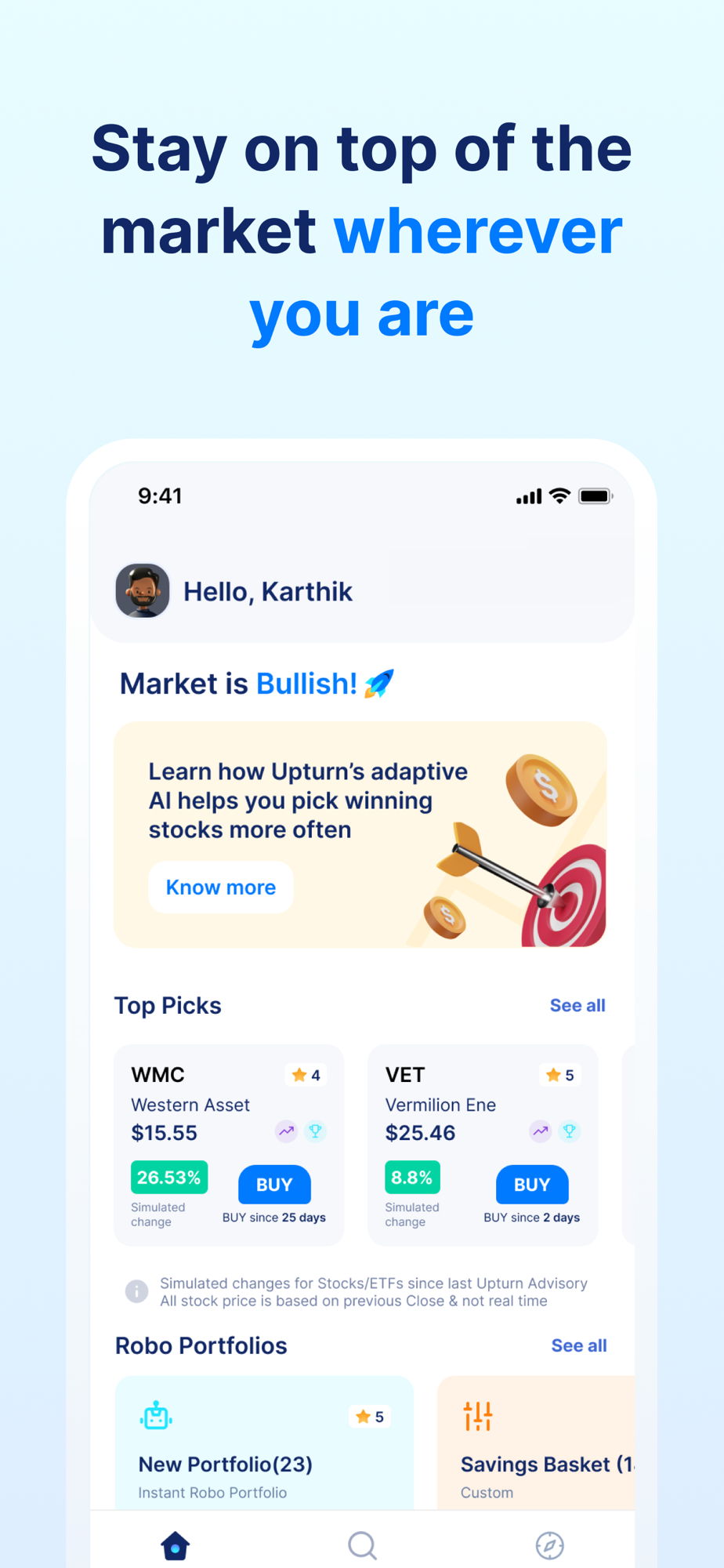 By using Upturn, users can look up Upturn advisories for individual stocks, identify top picks, and build Robo-Portfolios to identify new investments.