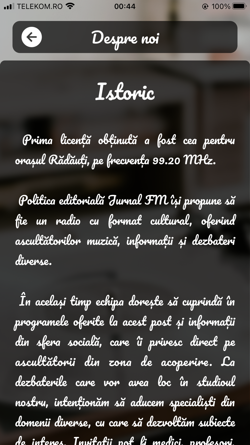 Aplicatia Jurnal FM ofera utilizatorilor posibilitatea de a asculta postul de radio Jurnal FM si de a urmari ultimele stiri.