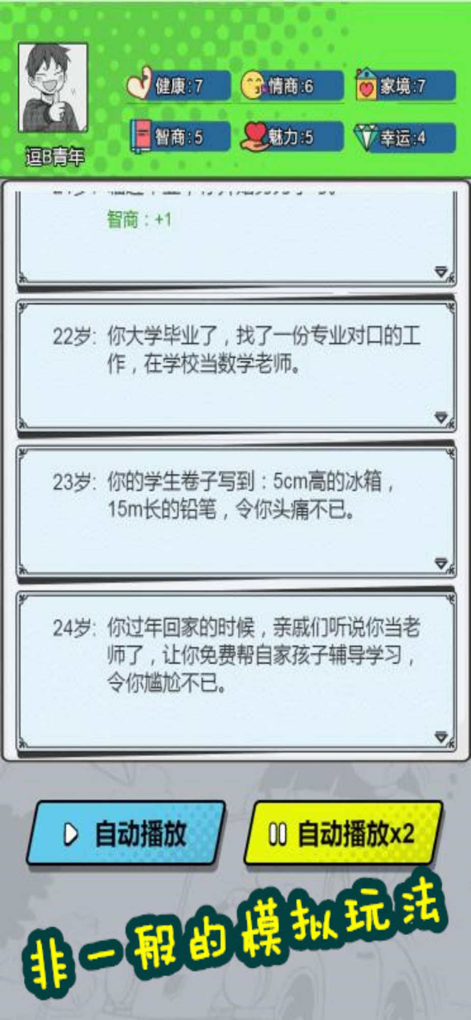 This is a simulation game that records daily life experience in the form of text. The plot presented is very creative. You can complete the challenge without consuming brain cells. There are also randomly released tasks to perform. Hurry to experience the simulation!