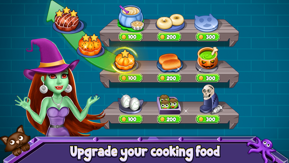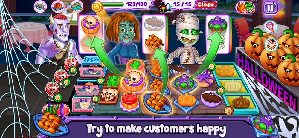 Levels in the game are designed to make you forget the world and enjoy the Halloween cooking experience. Head from one restaurant to another on this journey. You will unlock new restaurants as you go and explore the spooky Halloween valley.