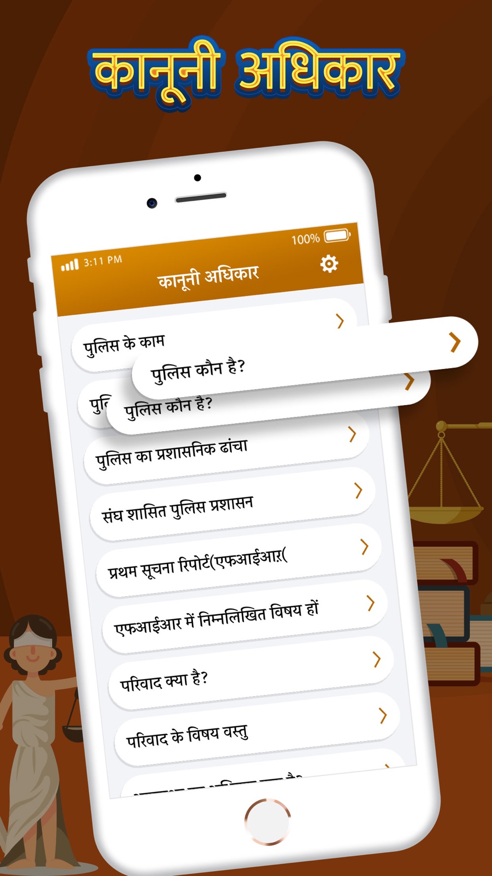 भारत का कानून आधुनिक भारत में कानून की व्यवस्था को संदर्भित करता है।भारतीय संविधान के मसौदे के बाद से, भारतीय कानून मानवाधिकार कानून और पर्यावरण कानून पर संयुक्त राष्ट्र के दिशानिर्देशों का भी पालन करते हैं। इस अप्प में भारत के कानून के बारे में विस्तारपूर्वक बताया गया है | इस अप्प में भारतीय दंड की धराये ,अपराध धराये और अपराध की सजा , मूलभूत क़ानूनी बाटे ,पुलिस और जनता के अधिकार , और ऐसे अन्य क़ानूनोंकी जानकरी दी गयी है | इस अप्प के इस्तेमाल से आपको भारतीय क़ानूनोंको जानने और समझने में आसानी होगी | भारतीय कानून में रूचि रखनेवालों के लिए महत्वपूर्ण अप्प.इस अप्प में आप महत्त्व पूर्ण कानून मनपसंद जानकारी नामक सूचि में स्टोर कर सकते है और उसे शेयर भी कर सकते है |