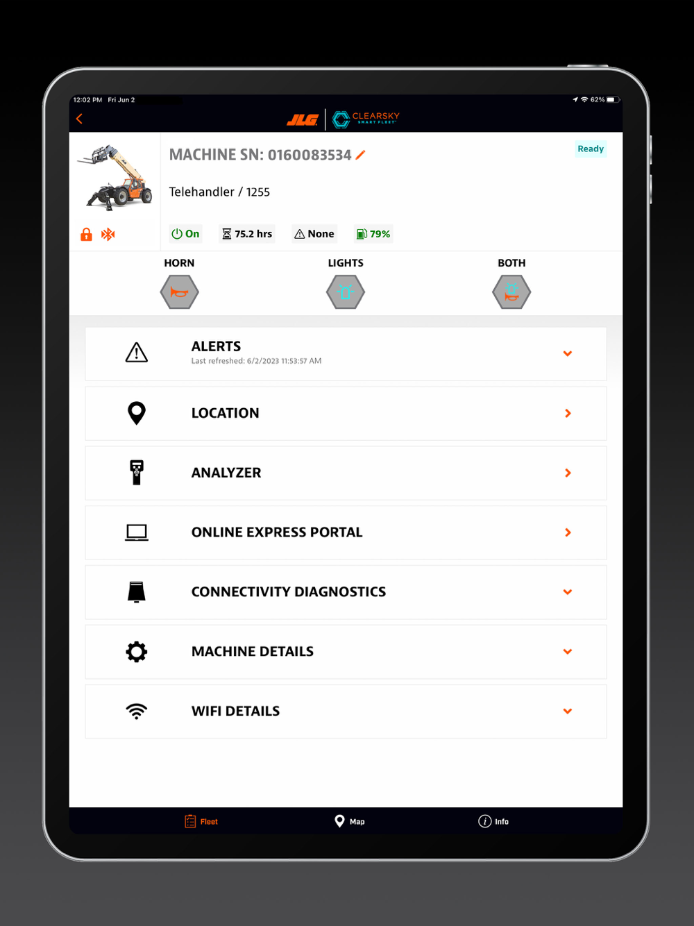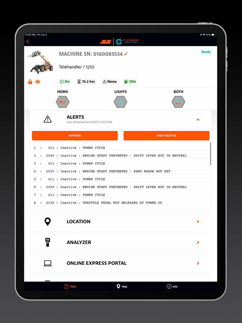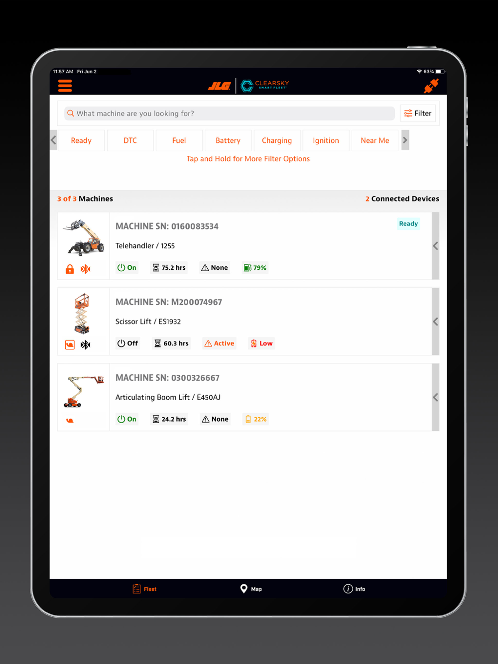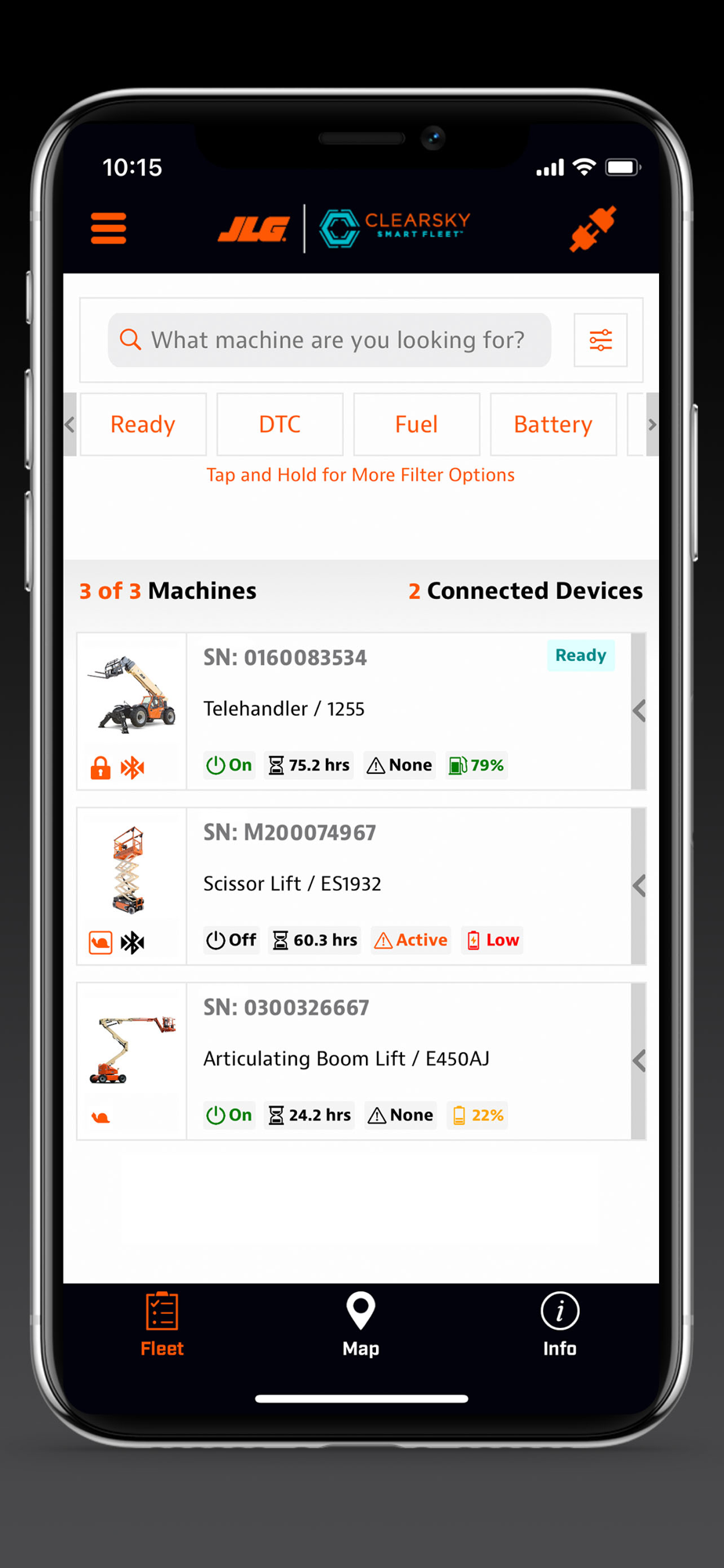 The ClearSky Smart Fleet companion app gives exclusive visibility to JLG assets and offers ground breaking interaction with properly equipped JLG machines within a local Site Network. It provides you with detailed information on your equipment's status, including fuel level, engine hours, location, and more while increasing productivity by easily locating machines and quickly diagnosing machine trouble codes. ClearSky Smart Fleet companion app also allows you to directly access your equipment, giving you the ability to adjust settings, and troubleshoot issues from your mobile device. It is incredibly user-friendly, with an intuitive interface and easy-to-use features that make managing your equipment a breeze.