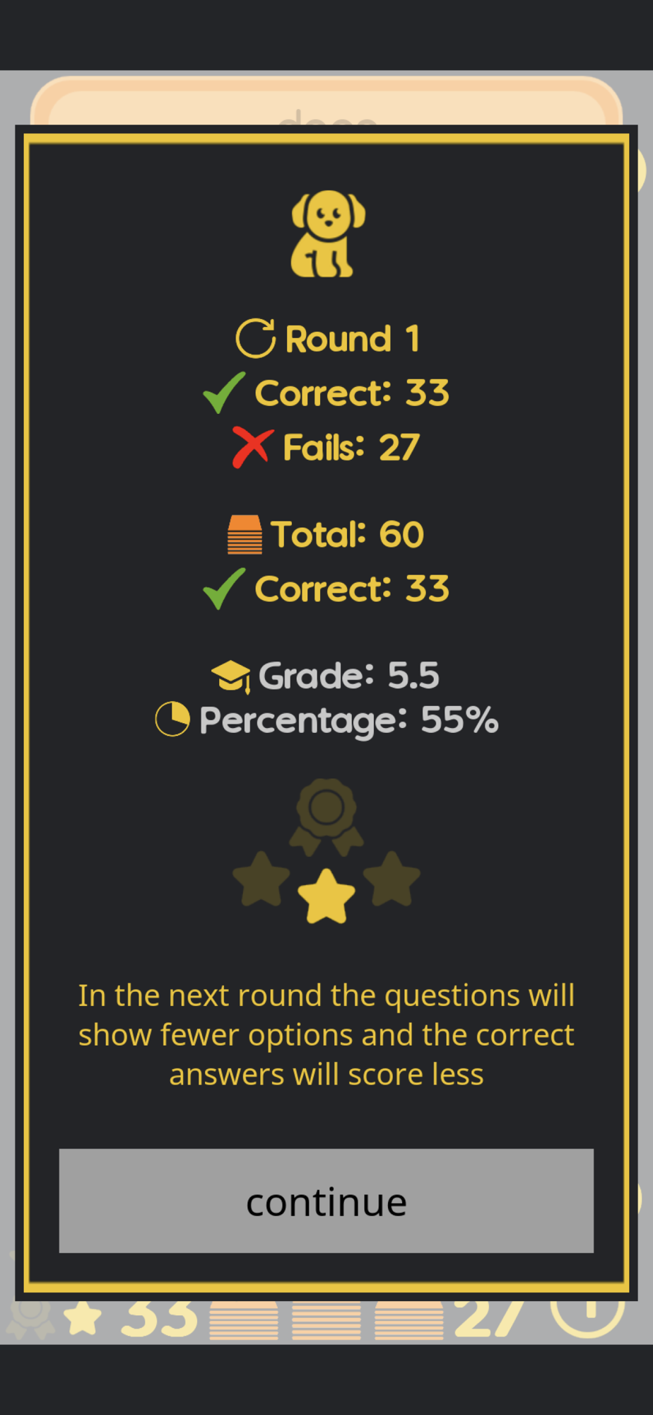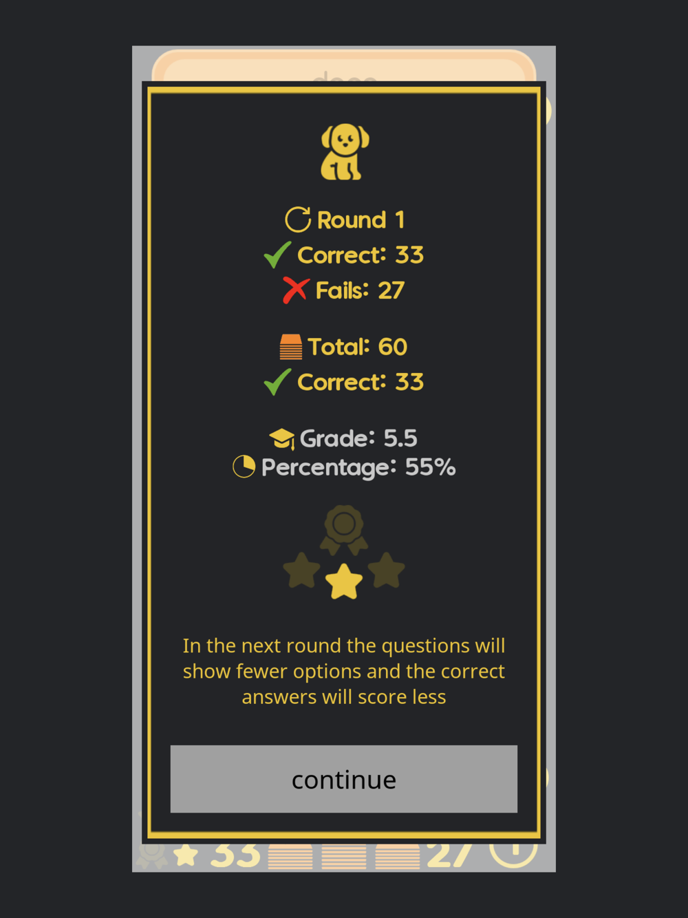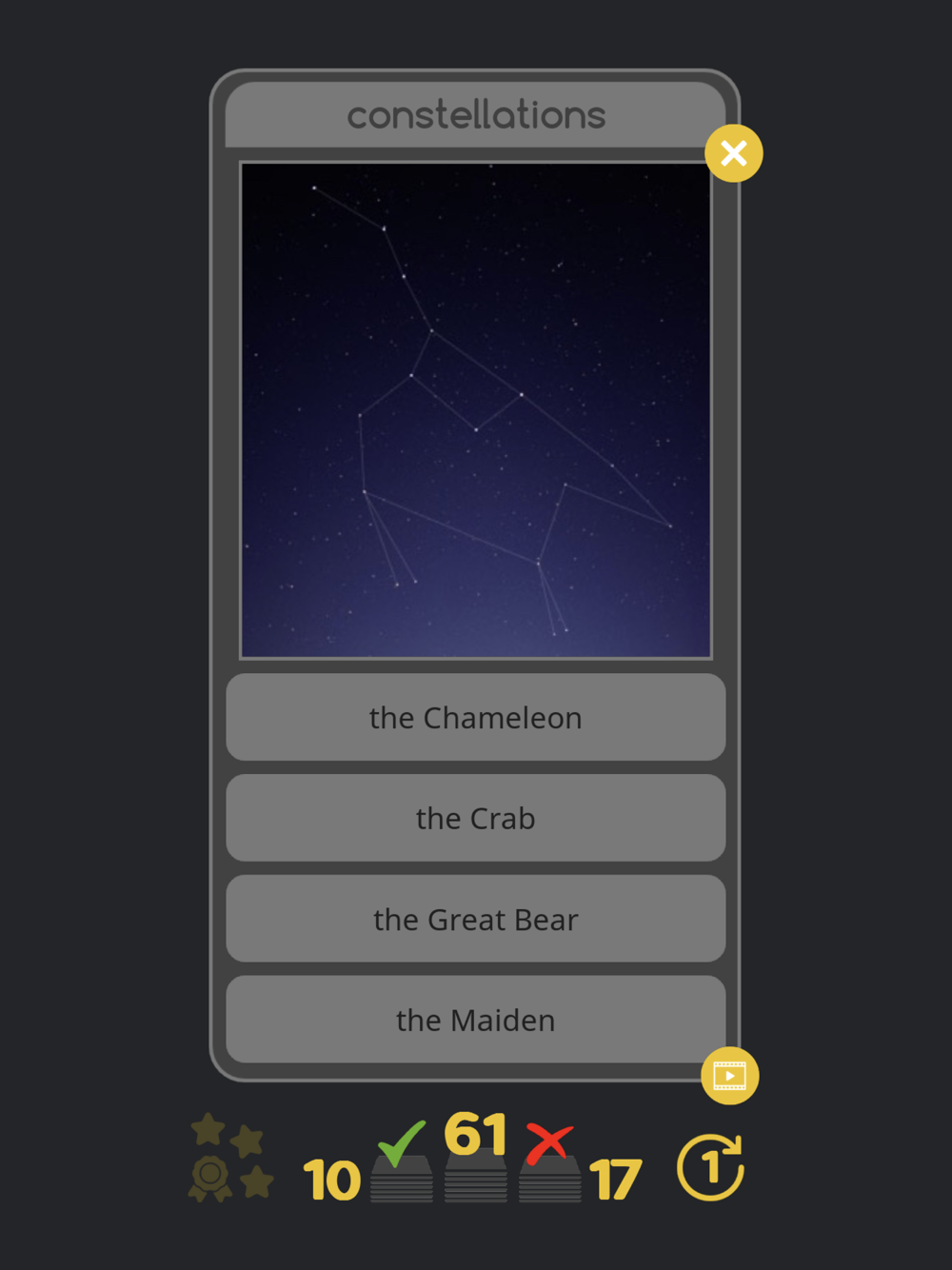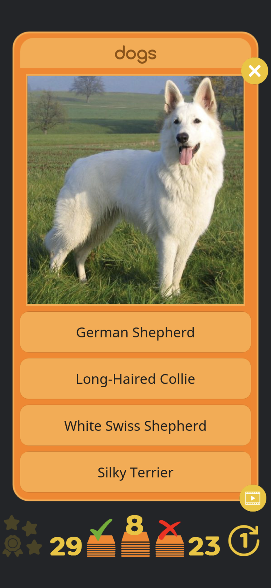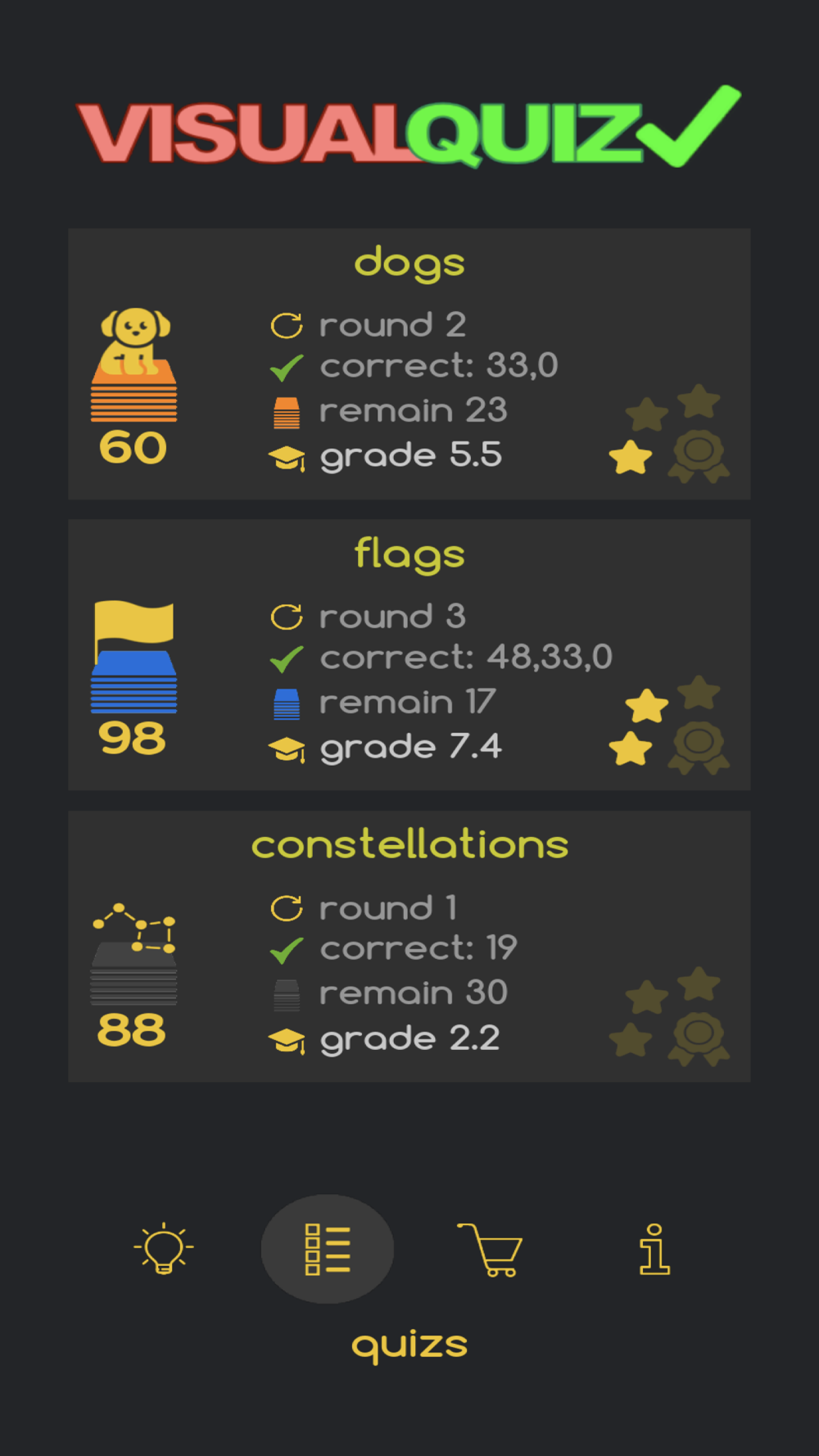 Quiz game about dogs, flags, constellations and more. Solve the tests without a time limit and in several rounds. Designed to learn and improve. Increase the score until you become an expert in each subject.