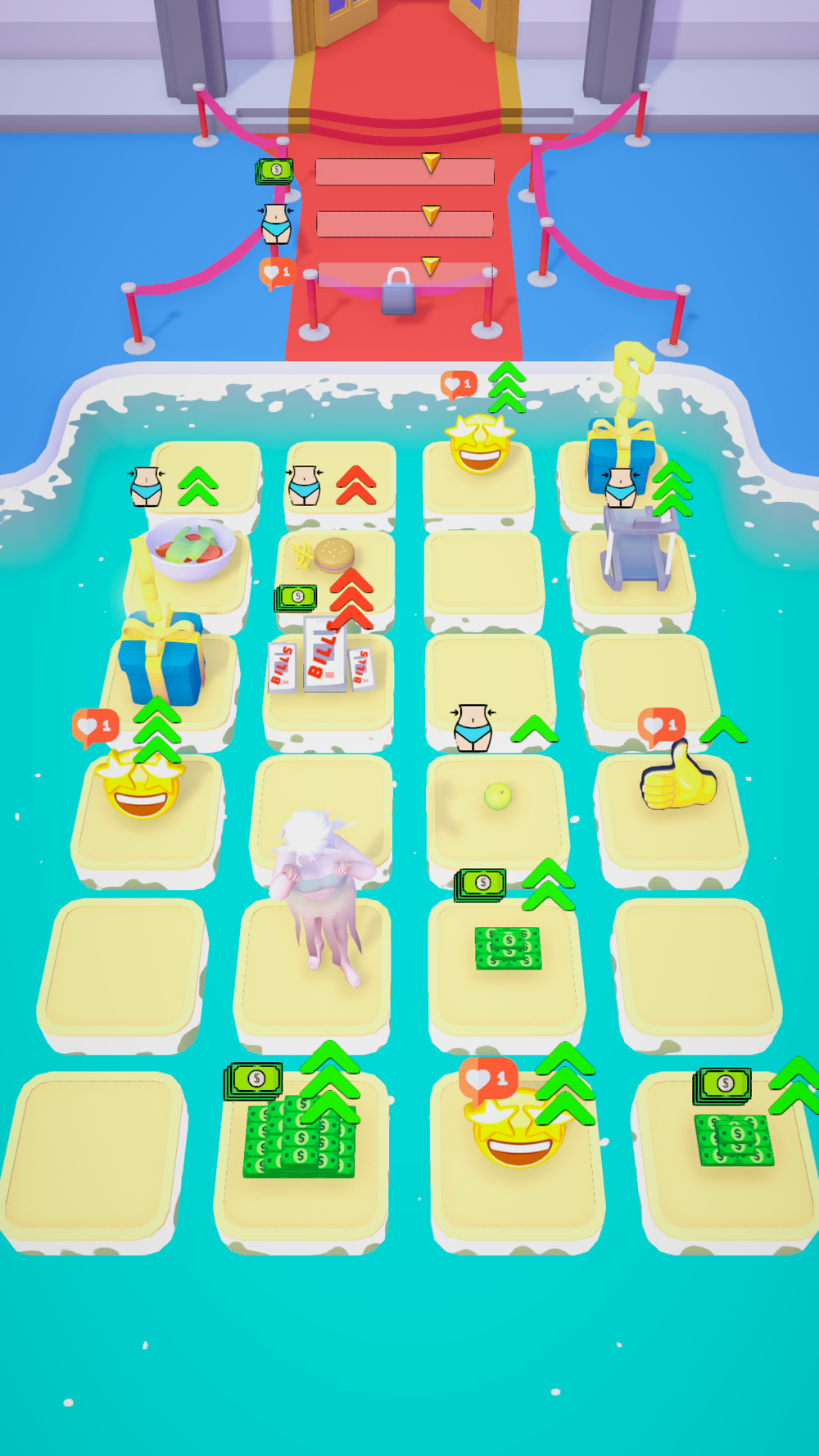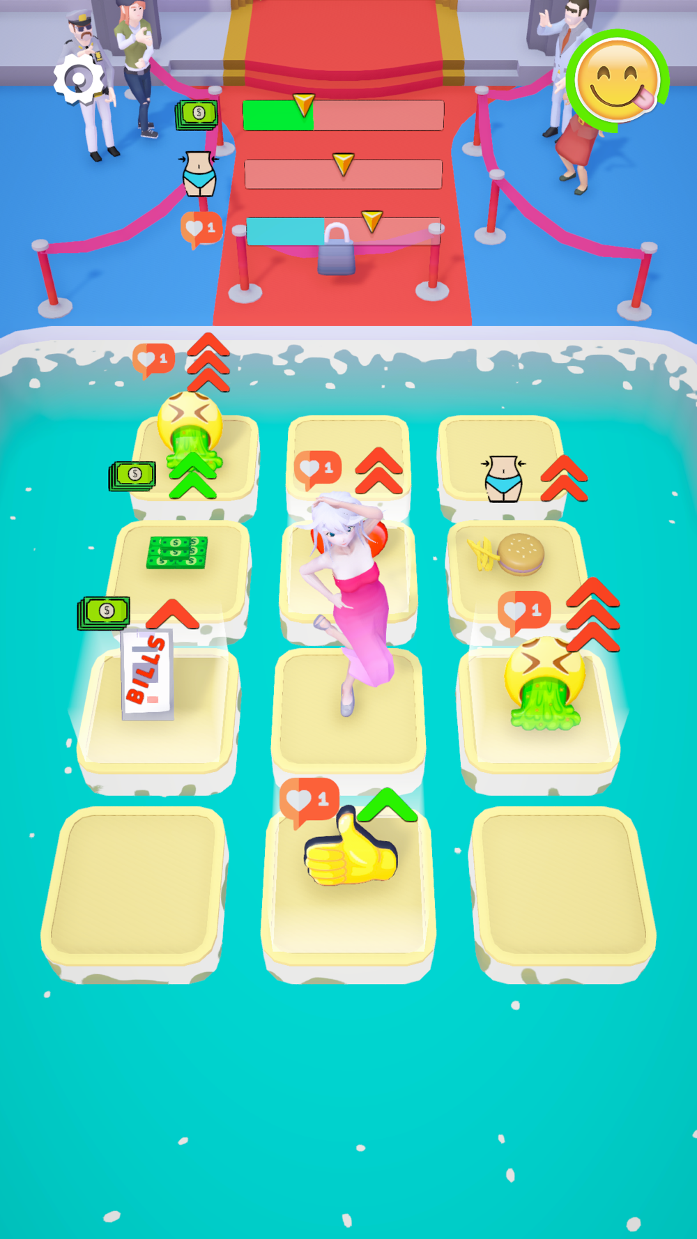 You need jump on platforms with good things and carry platforms with bad things
