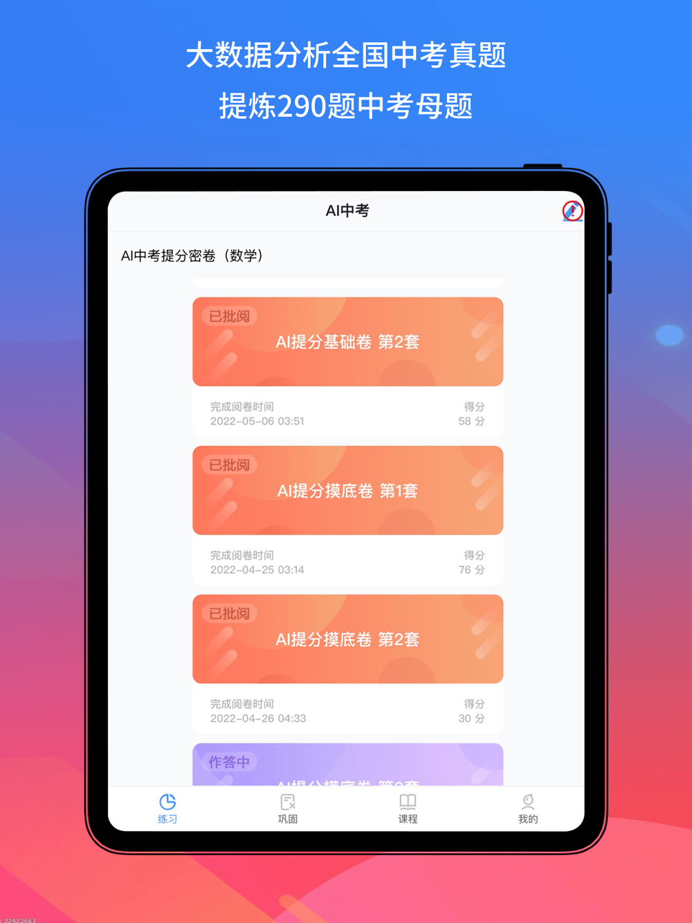 利用大数据技术分析最近全国中考真题,总结出290个题型、10套铺码母题卷。以智慧笔、铺码母题卷为载体,收集作答数据,通过大数据学情分析,精准定位薄弱知识点,并提供薄弱点名师视频讲解、错题举一反三变式练习,提供全面的精准学习服务。