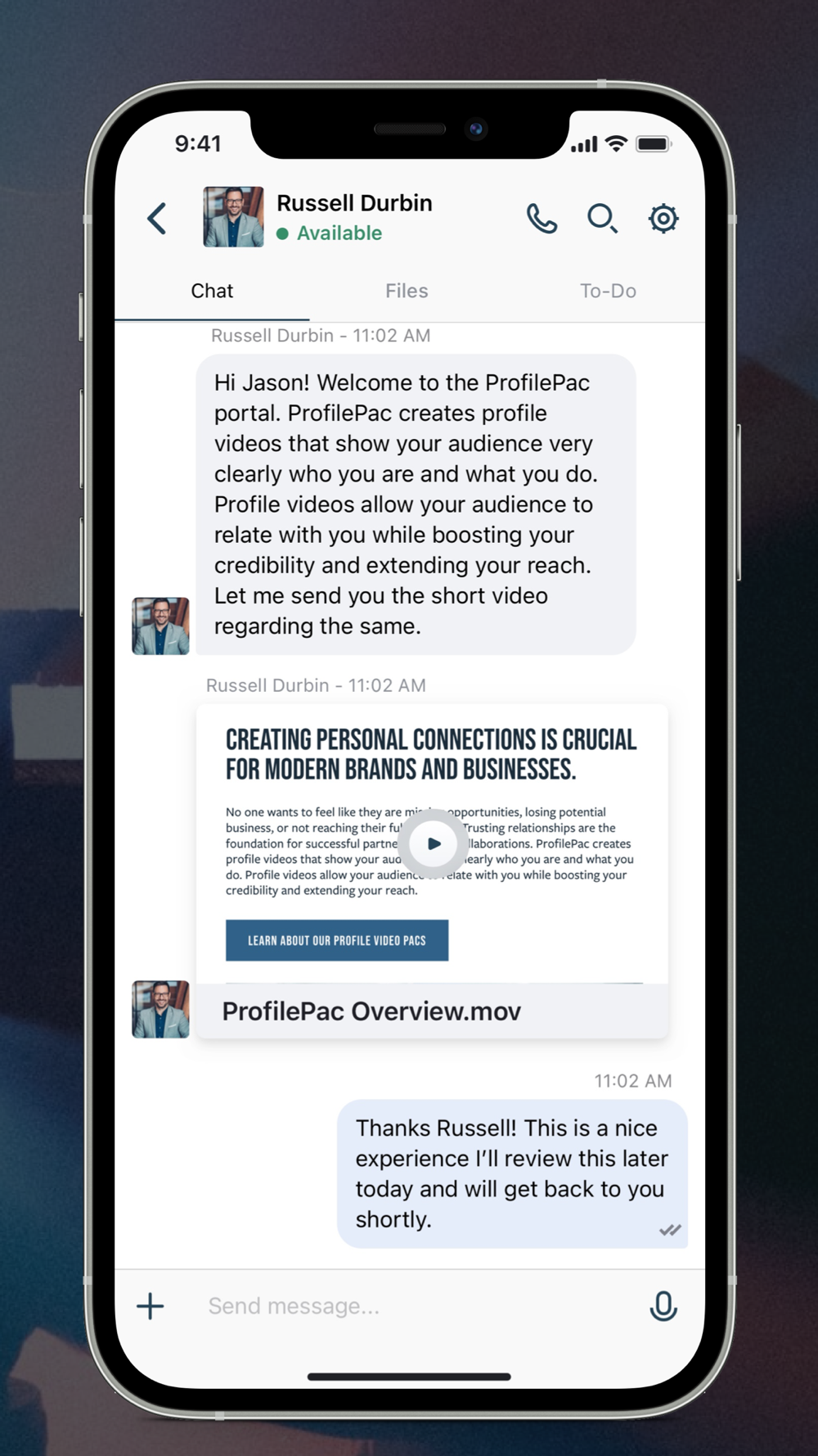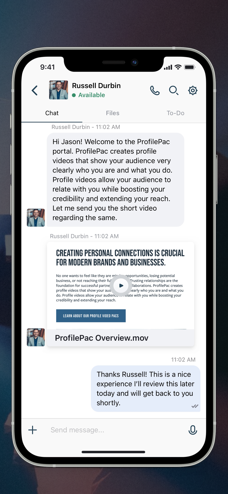 ProfilePac app provides you with direct access to our team. Use the ProfilePac app to message, meet, share documents, and more - for a streamlined video production experience.