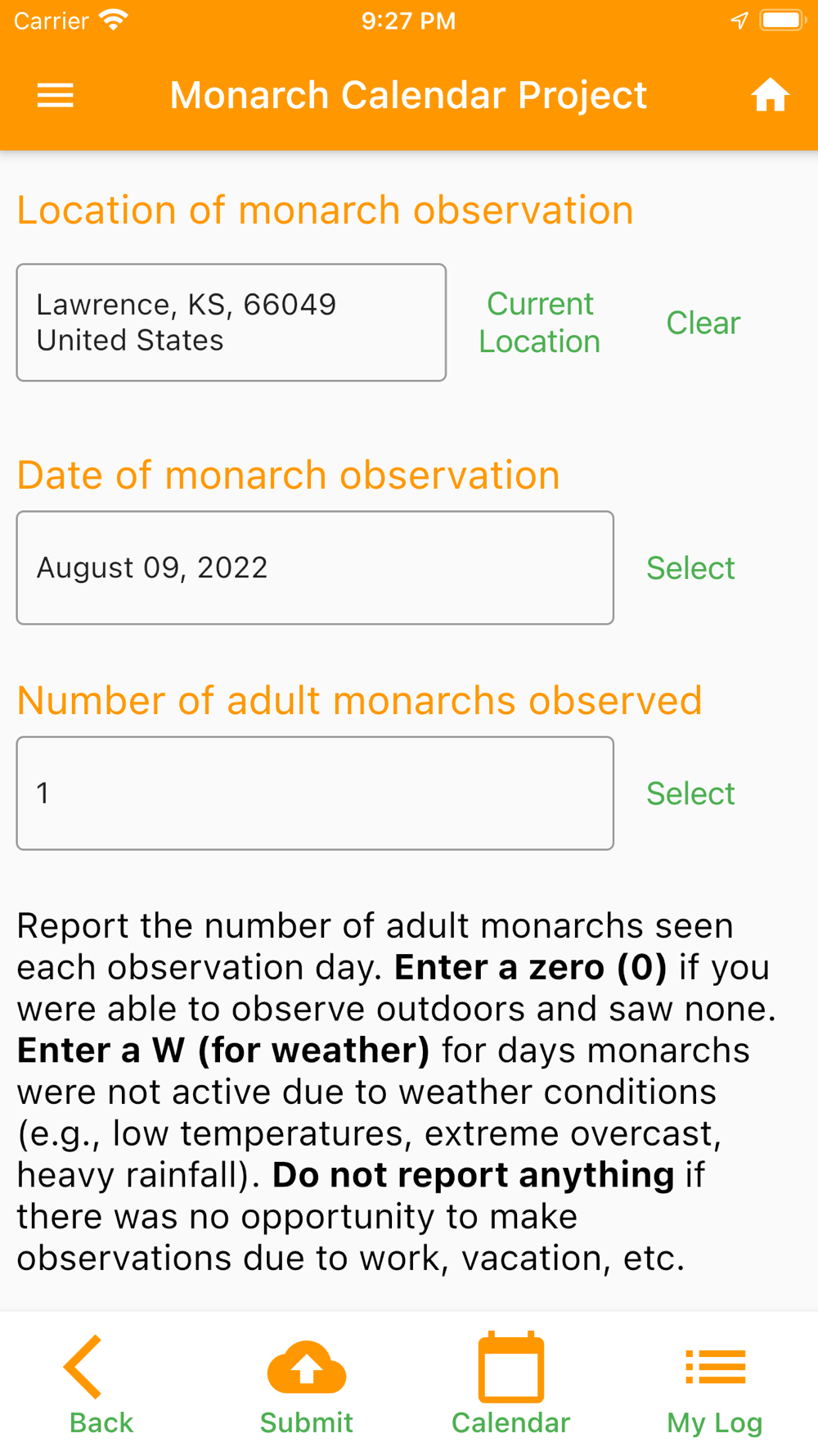 Participate in Monarch Watch community science projects and submit your monarch tagging, recovery and calendar data!